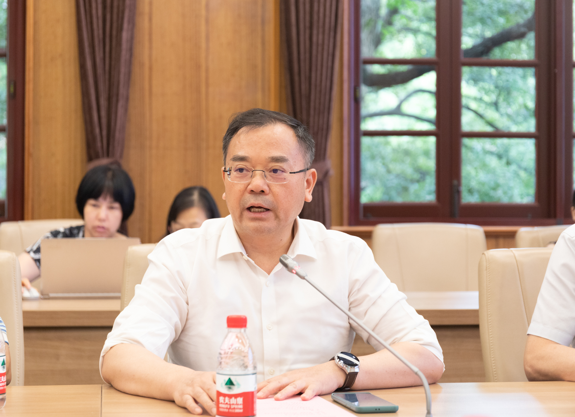 吴健在会议中表示,党的二十大报告指出“教育、科技、人才是全面建设社会主义现代化国家的基础性、战略性支撑”,高校应积极探索推进教育、科技、人才“三位一体”协同融合发展;习近平总书记在中共中央政治局第五次集体学习时强调,“要坚持把高质量发展作为各级各类教育的生命线,加快建设高质量教育体系。建设教育强国,龙头是高等教育。要把服务高质量发展作为建设教育强国的重要任务”。本学期研究生教育重点工作要以落实高等教育综合改革的“两个先行先试”为目标,加强学科交叉复合型人才、基础学科创新型人才、关键领域急需人才和人工智能AI+人才的培养,优化调整学科专业布局、大力发展和建设卓越工程师学院,持续推动研究生教育改革和高质量发展。随后,研究生招生办公室主任陈佳结合教育部文件通知要求,介绍华东师大2024年研究生招生计划配置实施与规划,以及考试招生重点情况。研究生院副院长、研究生培养办公室主任杨福义从暑期工作推进、本学期重点工作两方面,介绍研究生卓越教学体系建设、专业学位教育高质量发展、规范学籍管理、打造高水平研究生教育管理团队和推进研究生教育国际化升级等工作。学位管理办公室主任李海生围绕学位点建设、导师队伍建设、学位授予质量监管和推动学科交叉中心建设等四方面介绍了本学期重点工作。