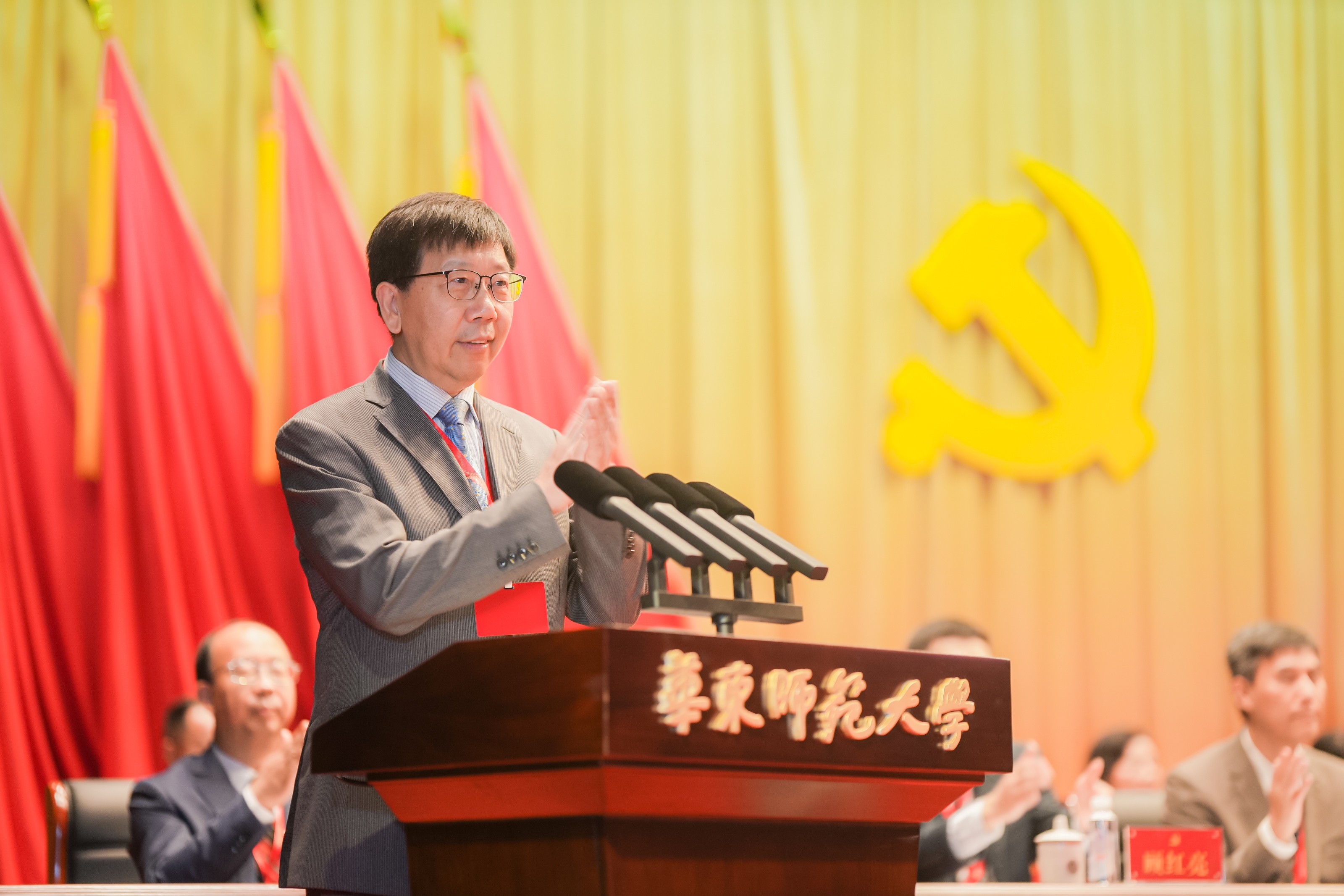 中共上海市教育卫生工作委员会书记沈炜、教育部教师工作司副司长黄小华出席大会。校领导梅兵、钱旭红、杨昌利、曹友谊、孟钟捷、戴立益、雷启立、顾红亮、施国跃、程静等在主席台前排就座。