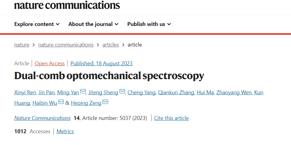 相关成果以 Dual-comb optomechanical spectroscopy 为题在国际期刊 Nature Communications 在线发表。闫明研究员、盛继腾研究员、武海斌教授、曾和平教授为通讯作者,任心仪博士及研究生潘瑾为本文共同第一作者。