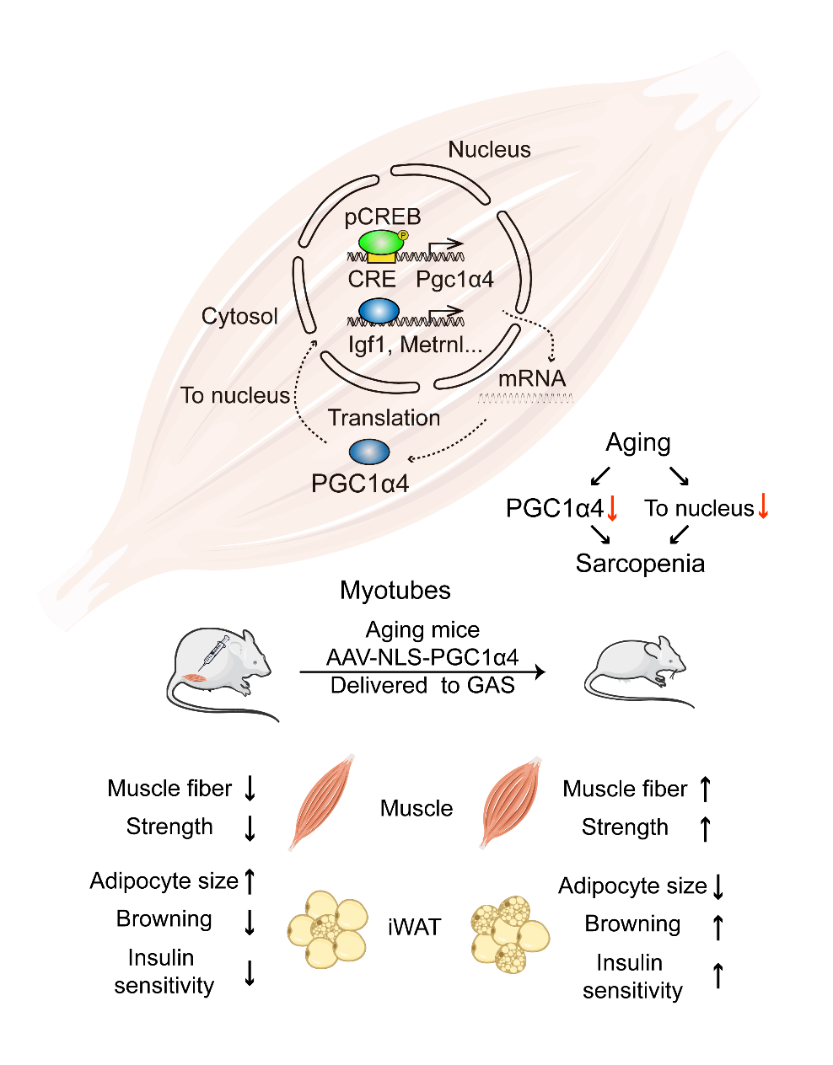 生命科学学院徐凌燕团队开发出AAV-NLS-PGC1α4,对抗肌少症和衰老相关代谢紊乱。针对PGC1α4在衰老骨骼肌中的动态变化特性,添加核定位信号肽,增加细胞核中发挥转录共激活因子功能的PGC1α4蛋白水平,并由AAV靶向递送到骨骼肌中。发现其通过IGF1和METRNL高效改善骨骼肌和脂肪衰老,促进系统能量稳态。