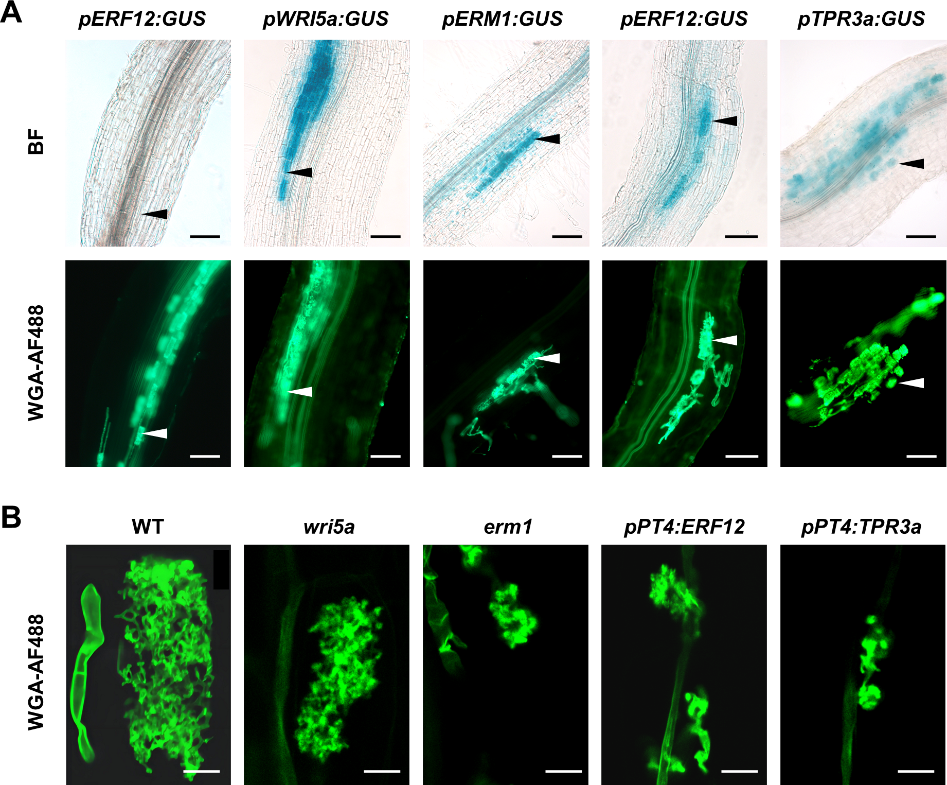 研究首先证明Half-size ABCG转运蛋白STR通过与STR2形成转运二聚体,介导苜蓿脂肪酸向丛枝细胞供应。接下来,以STR2在丛枝菌根真菌共生中的功能及其调控机制为起点展开研究,鉴定到ERF家族两个新的转录因子ERM1和ERF12拮抗调控营养交换基因表达和丛枝发育。其中,ERM1通过靶向AW-box与AW-box-like元件激活下游脂质合成及转运相关的靶基因表达,正调控菌根共生。ERF12是植物中鉴定到的首个负调控丛枝营养交换的转录因子,可通过招募TOPLESS家族辅抑制因子TPR3a,负调控菌根共生。本研究成果的发表,加深了对于菌根共生中植物营养交换调控机制的理解,并为菌根共生的遗传改良及农业实践提供了重要的理论依据。