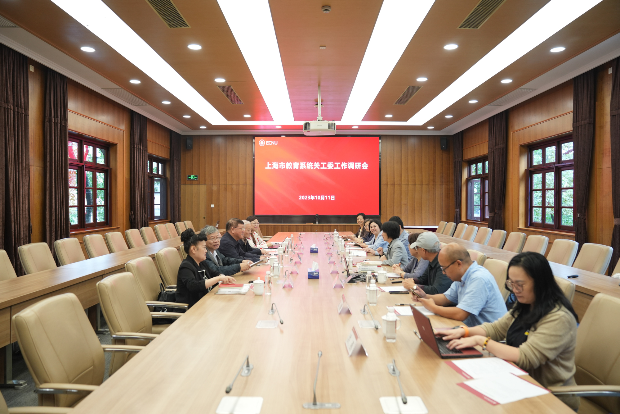 为保障新时代关心下一代工作抓好抓实,走深走细,推进上海市教育系统关工委理论研究基地建设,10月11日上午,市教育系统关工委主任李宣海,驻会副主任俞恭庆,市教卫工作党委二级巡视员、老干部处处长、市教育系统关工委秘书长金勤明,市教委德育处处长朱敏,市教育系统关工委办公室常务副主任王亚男等到我校调研。校党委书记梅兵,校党委副书记、副校长、关工委主任顾红亮,校关工委常务副主任杜公卓,校党委常委、统战部部长、校办公室主任张惠虹,校党委学生(研究生)工作部部长兼关工委副主任赵健,校关工委副主任孙桂华,副主任兼办公室主任朱月琴,校关工委理论研究基地课题组负责人朱希祥等出席调研会。调研会由顾红亮主持。