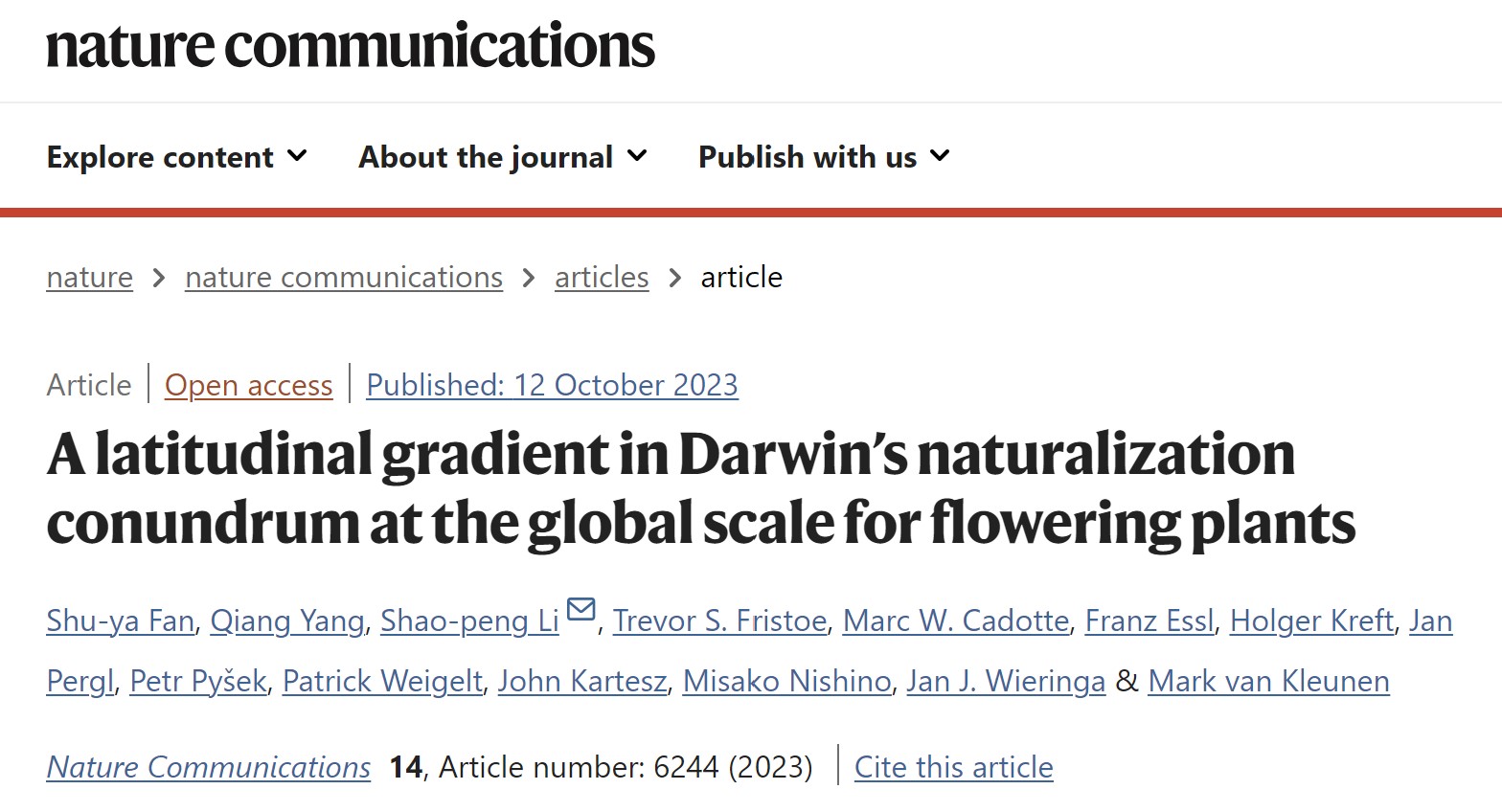 这项成果以“A latitudinal gradient in Darwin’s naturalization conundrum at the global scale for flowering plants”为题在线发表于Nature Communications。3245澳门新莆京直博生范舒雅同学和德国生物多样性综合研究中心杨强博士后为该论文的共同第一作者,3245澳门新莆京黎绍鹏教授为本文通讯作者,3245澳门新莆京为论文的第一完成单位。合作者包括德国Mark van Kleunen教授、波多黎各Trevor S. Fristoe教授和加拿大Marc W. Cadotte教授等研究人员。该研究受到国家自然科学基金优秀青年科学基金项目、面上项目和中央高校基本科研业务费专项资金等项目资助。