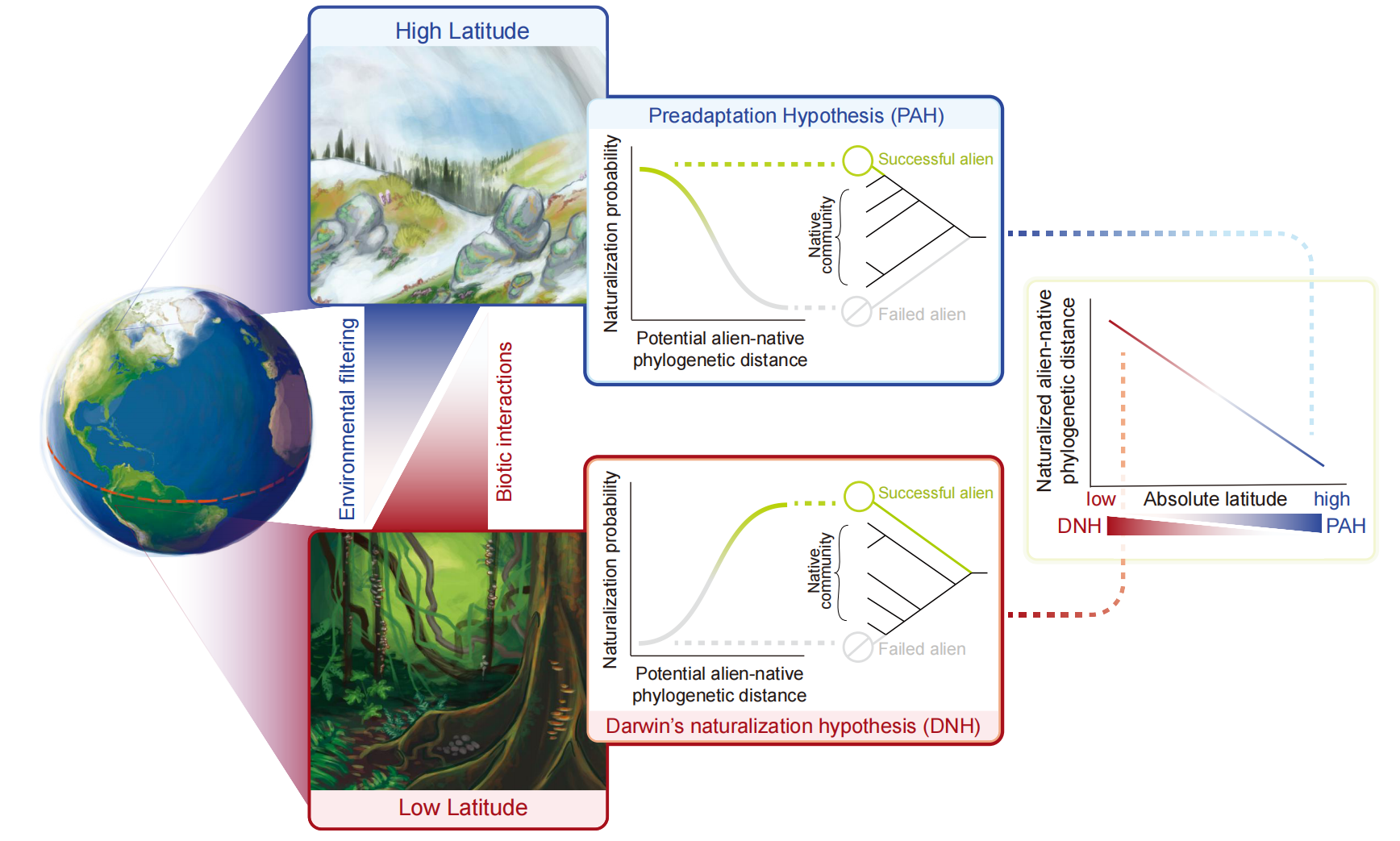 图2研究提出的全球纬度梯度上达尔文归化谜团概念框架。该框架指出,在高纬度和低纬度地区,与本地物种亲缘关系近和远的外来物种分别更容易成功归化。
