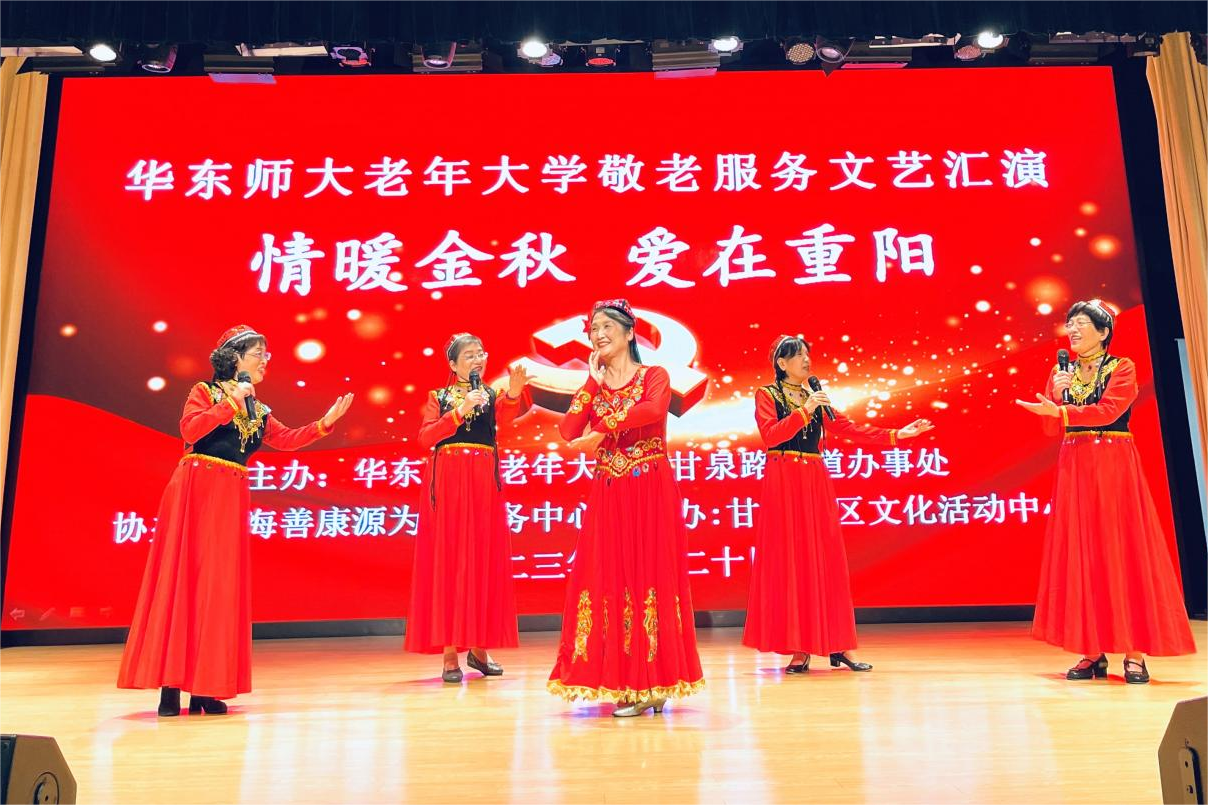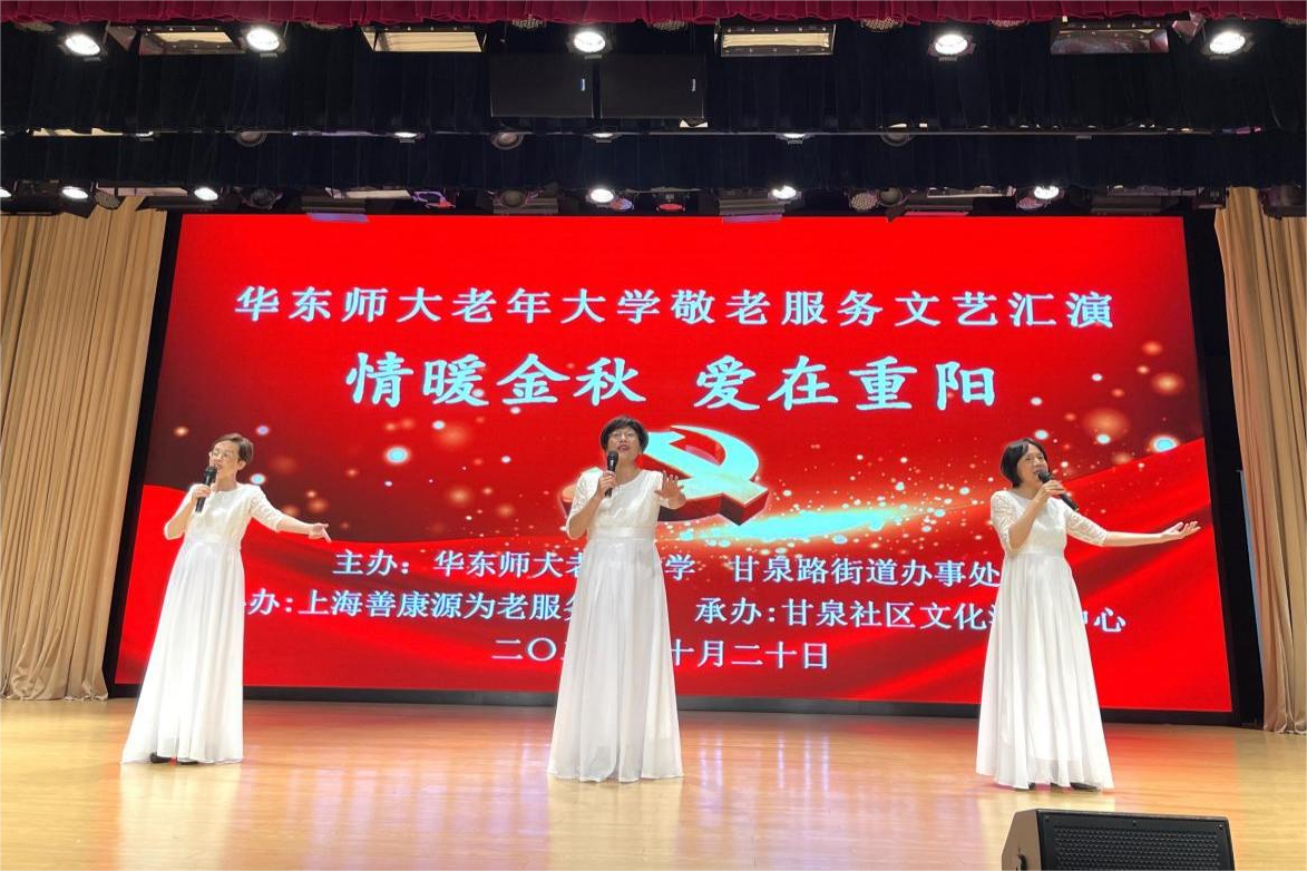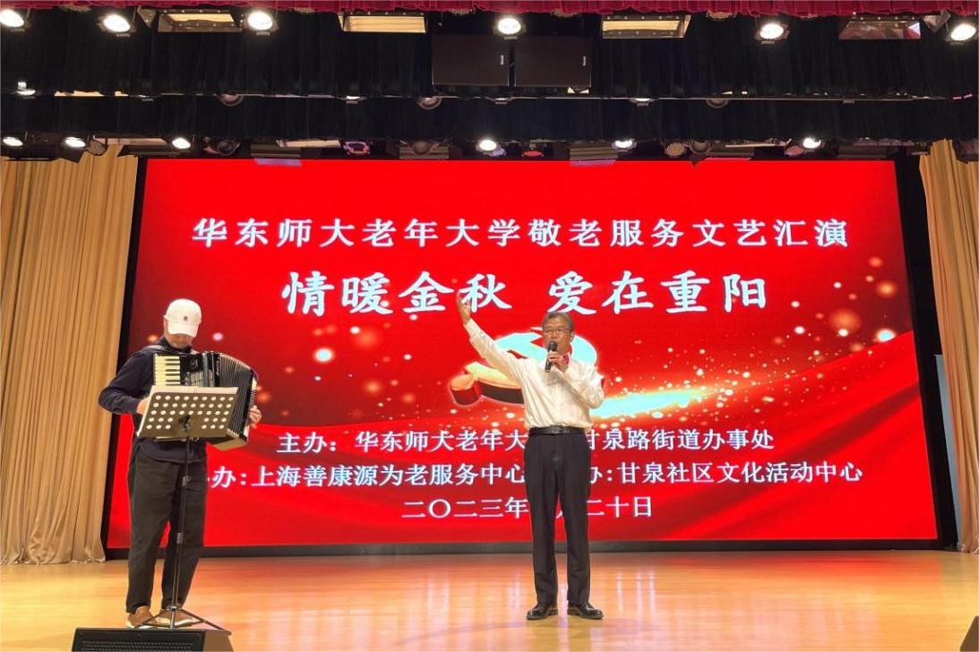 金秋十月,丹桂飘香。10月20日下午,在重阳节来临之际,华东师大老年大学组织师生志愿服务队赴普陀区甘泉街道社区文化活动中心,开展敬老服务进社区文艺汇演。甘泉路街道办事处副主任顾旻娜、华东师大老年大学常务副校长裴建华、甘泉社区服务办主任施明浩、上海善康源为老服务中心负责人毛建农以及甘泉社区居民200余人出席并观看演出。