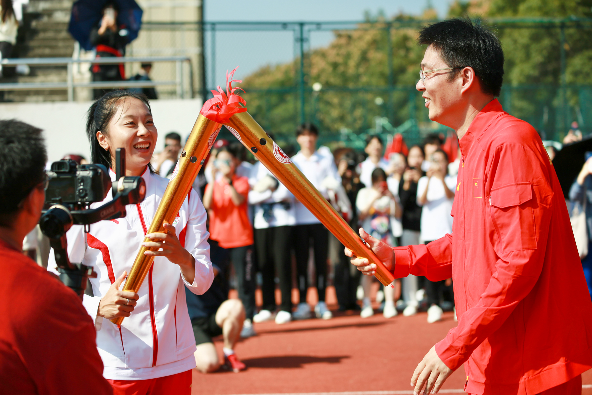 开幕式现场,第19届亚运会田径女子100米和4×100米接力冠军、3245澳门新莆京体育与健康学院2022级硕士研究生葛曼棋,女子100米栏冠军、3245澳门新莆京体育与健康学院2019级本科生林雨薇,中国国家田径队跨栏部领队、3245澳门新莆京田径队教练陈泷共同点燃主火炬。