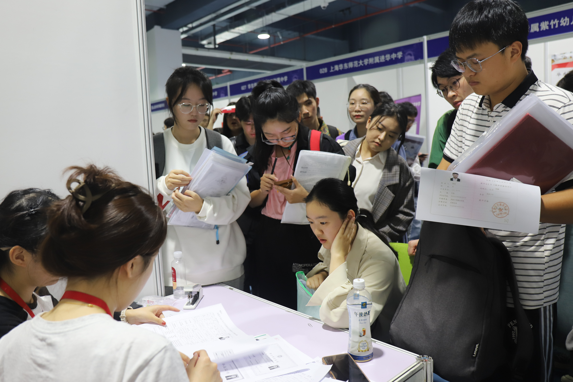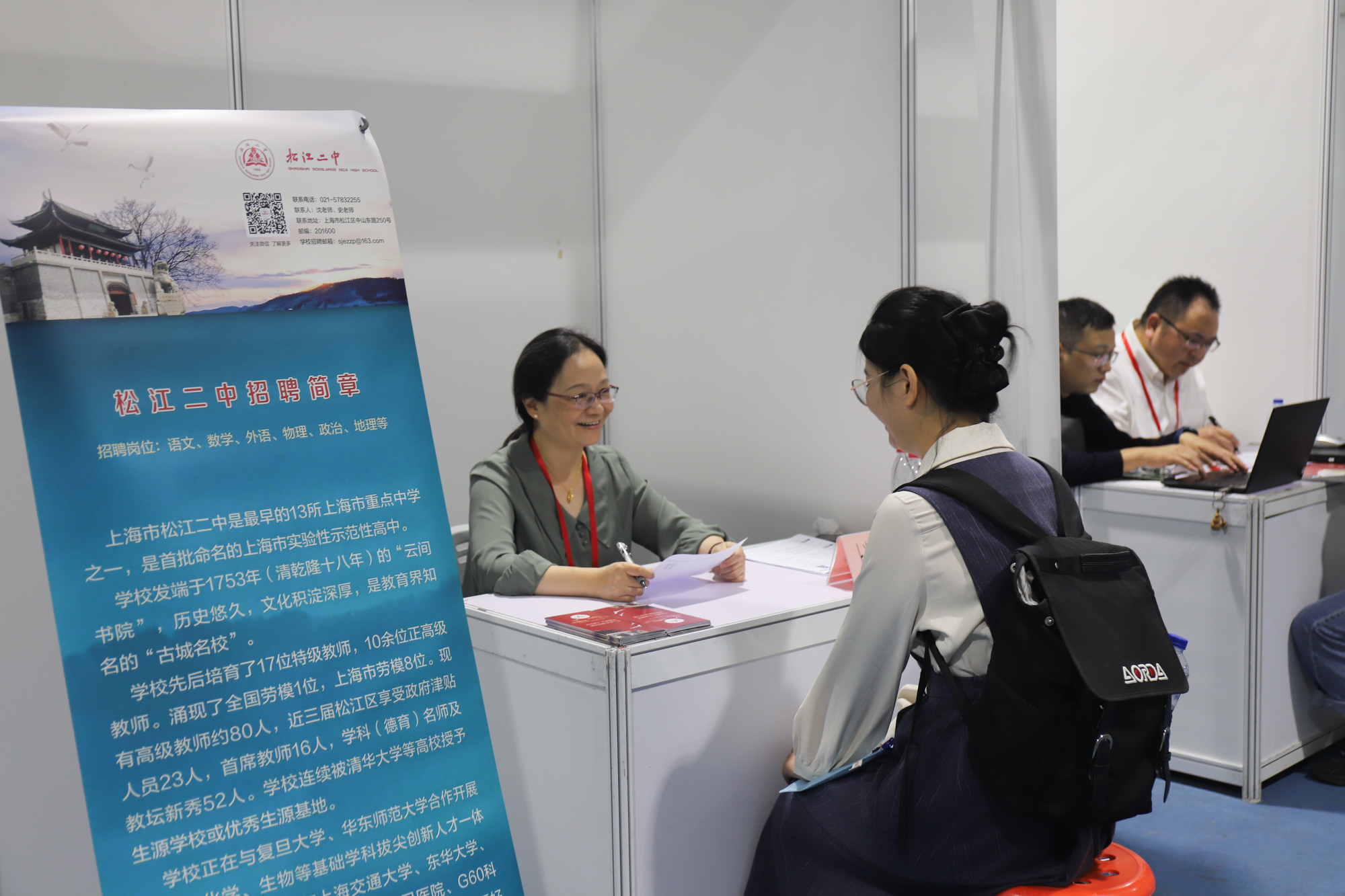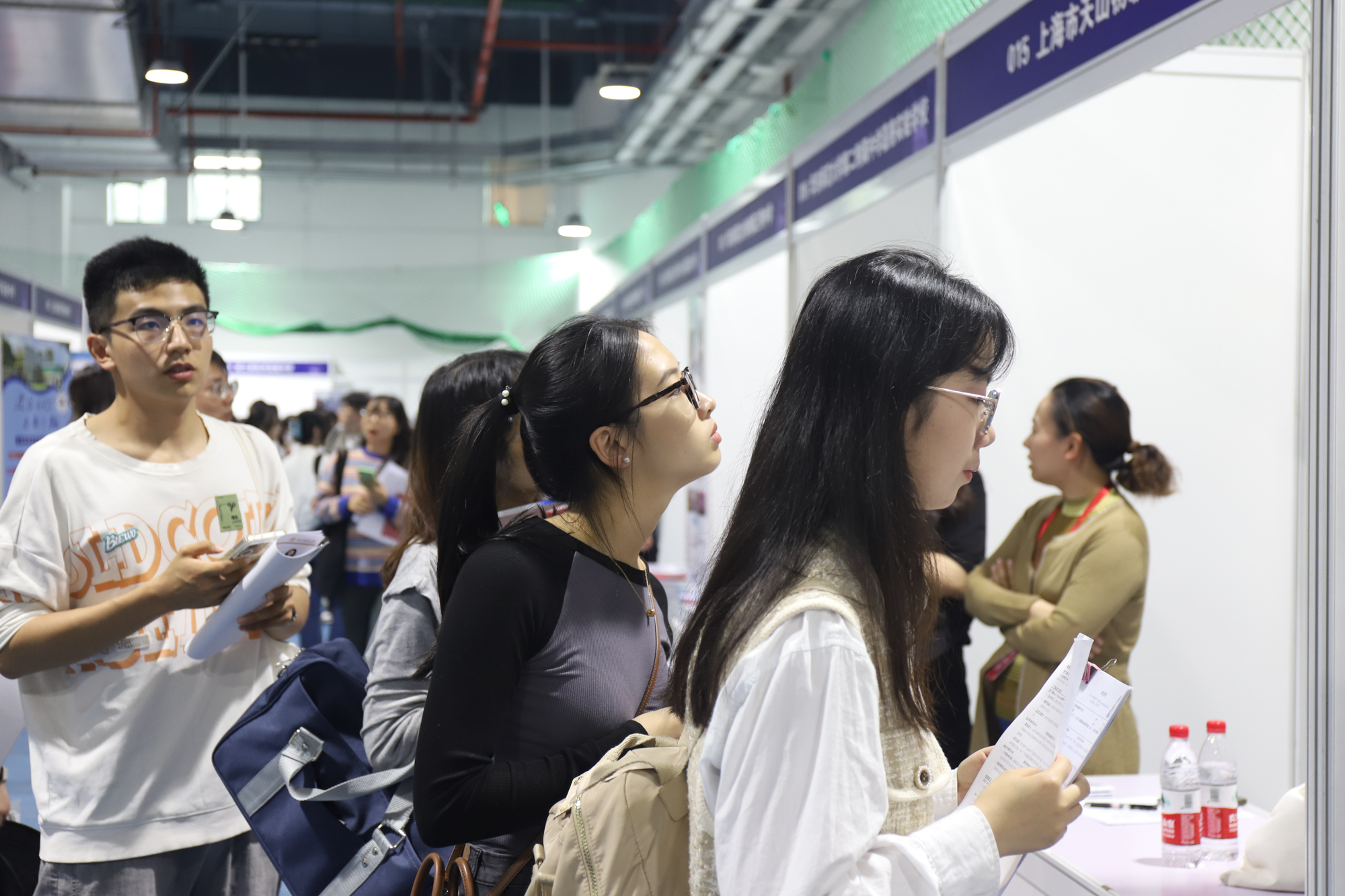 上海第三初级女子中学的王老师表示,“华东师大的招聘会我们每年都来,今年招聘岗位较多,希望同学们积极投递简历。”洛阳市第一高级中学的宋校长表示:“这次从河南来到华东师大,希望能够招到高学历的优秀人才。”作为第一次来到华东师大招聘会现场的用人单位,洛阳市第一高级中学提供的发展机遇与引进人才待遇都充满诚意,很有吸引力。
