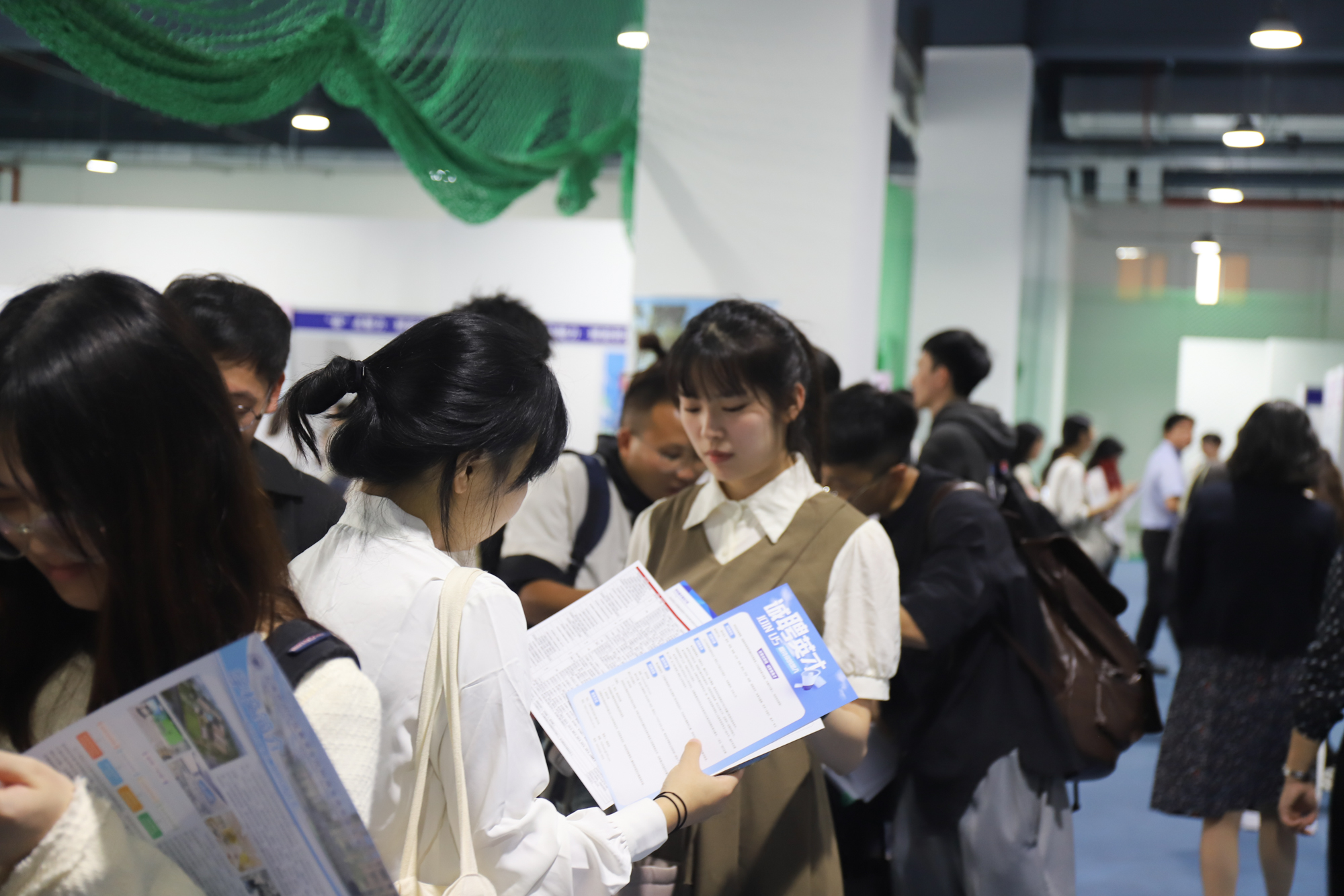 现场气氛热烈,同学们在等候期间交流面试经验,积极向用人单位了解岗位需求,有序排队投递简历。