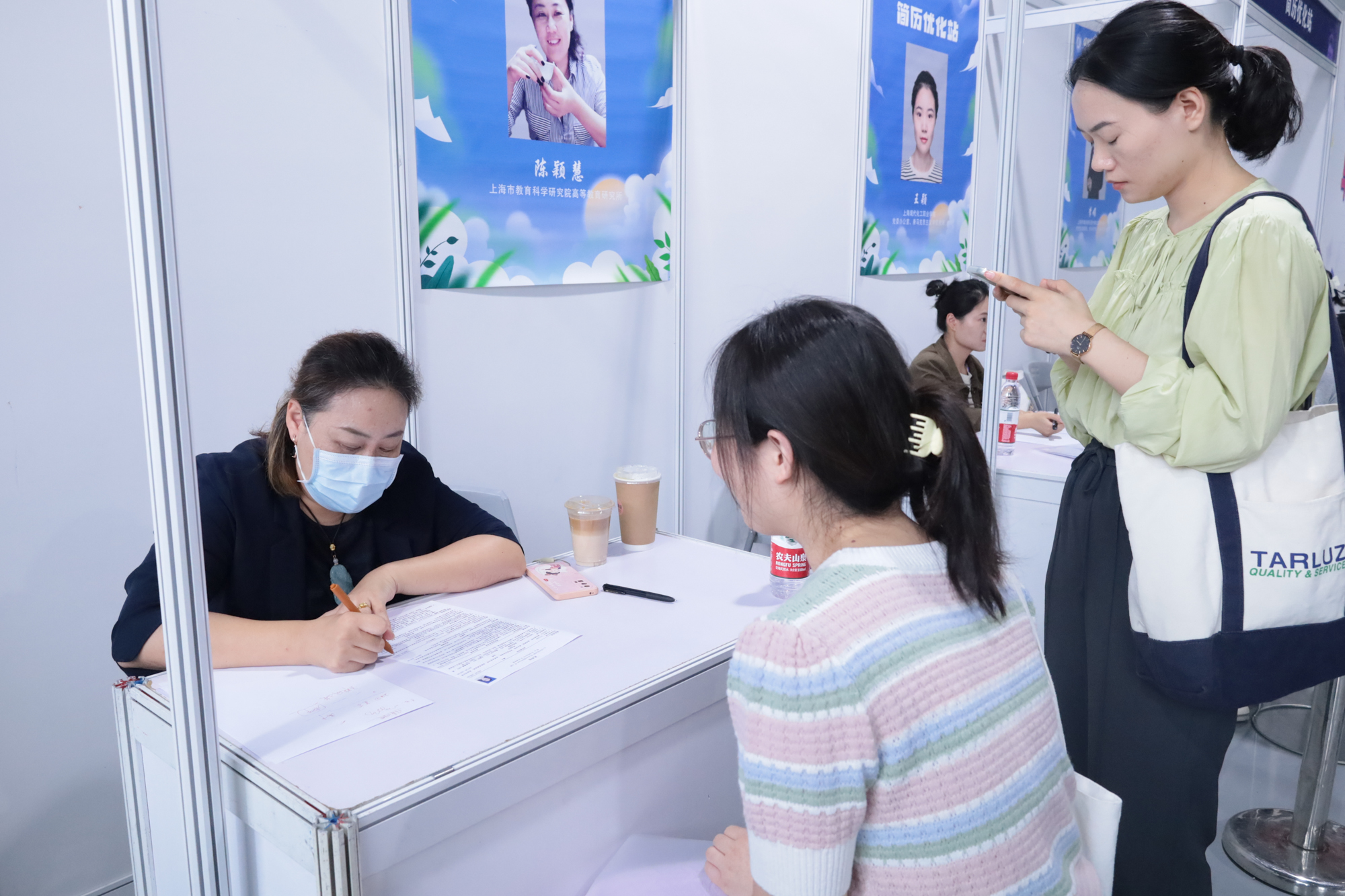 在招聘会现场,华东师大学生职业发展中心设立“卓越教师 直面未来”生涯指导专区,包含简历优化站、“妆”点魅力·赋能职场、全国大学生职业生涯规划大赛宣讲三大展位和“教育家精神”价值引领区。