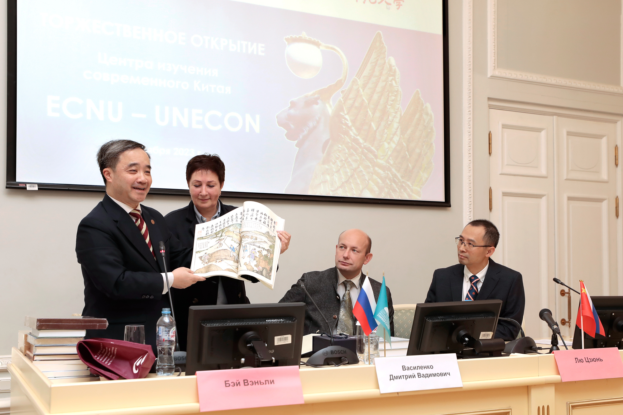 揭牌仪式后,中心中俄双方主任向参会师生介绍了该中心成立的意义、主要任务,以及未来发展方向。此外,为支持圣彼得堡国立经济大学中文教育的发展和中国问题研究的深入,华东师大向新成立的中心赠送《御用耕织图》影印本、中国古诗词俄文版、华东师大教授著作的俄译本及中文著作等。贝文力对赠送书籍进行了介绍,受到现场师生的关注。
