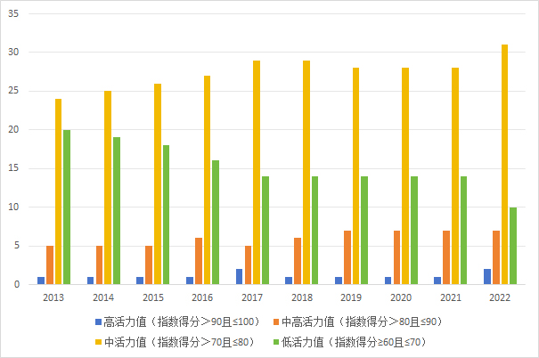 2013年至2022年共建“一带一路”国家港口发展活力指数得分分布情况