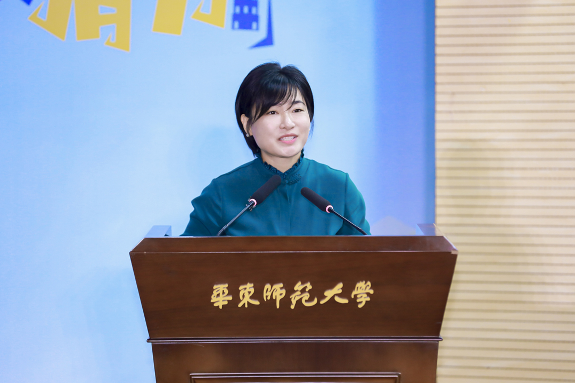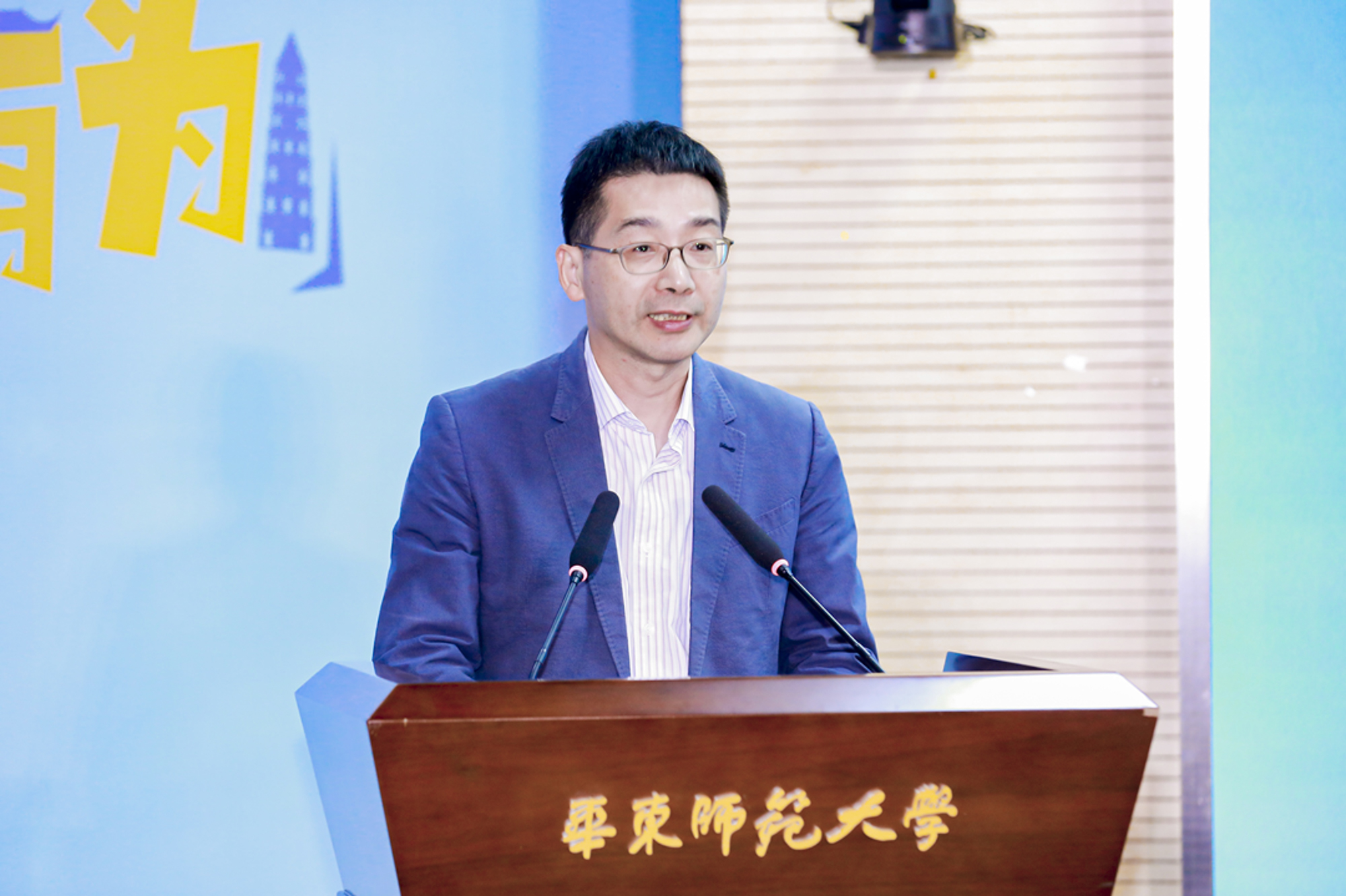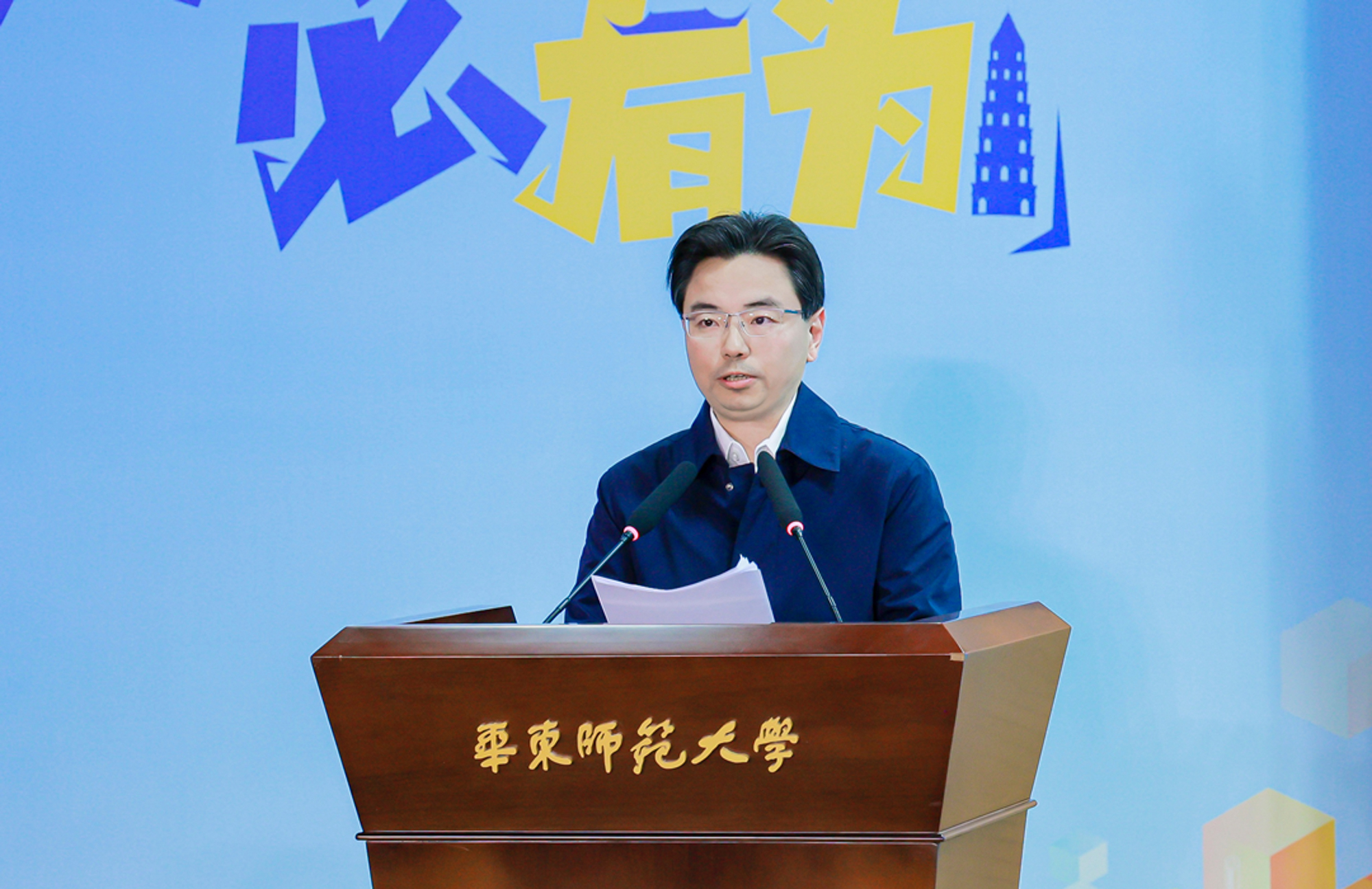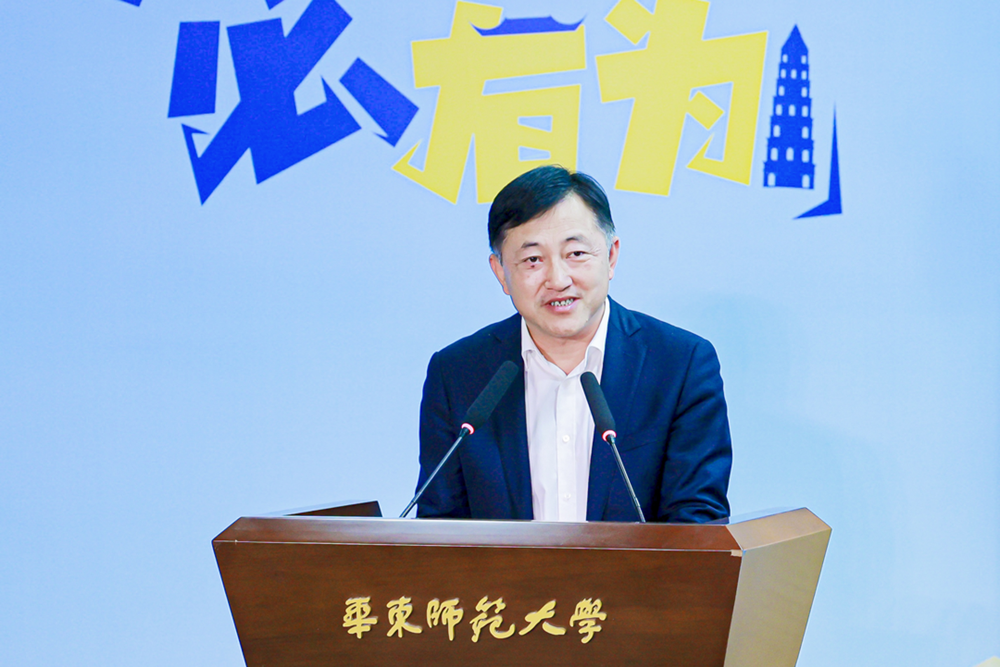 杨斌主持活动,表示吴江与华东师大因水结缘、情谊深厚,期待各位同学能够选择苏州、选择吴江,在这片创新创业的蓝海中乘风破浪、扬帆远航!