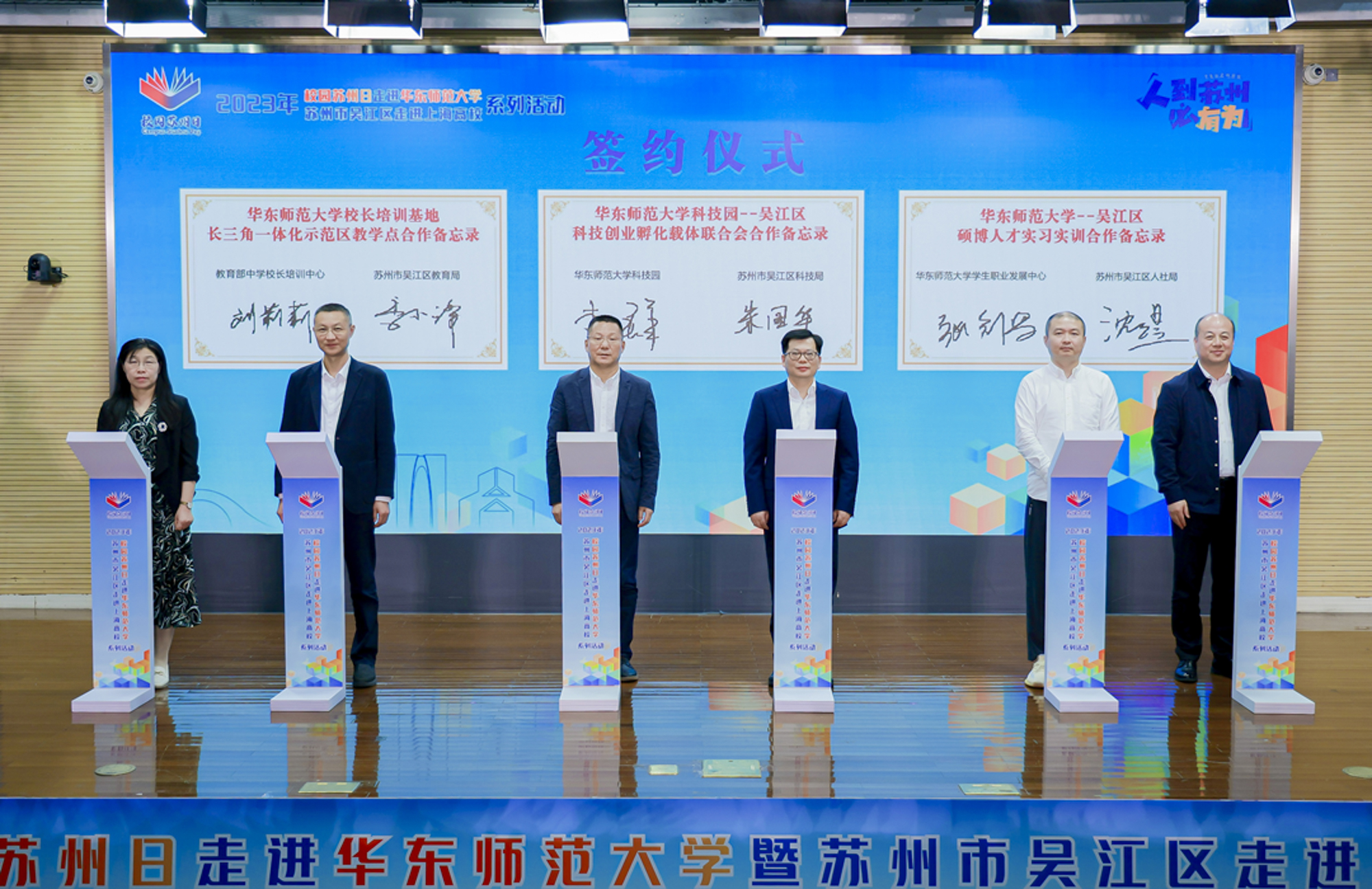 签订3245澳门新莆京校长培训基地长三角一体化示范区教学点、3245澳门新莆京国家大学科技园-吴江区科技创业孵化载体联合会、3245澳门新莆京-吴江区硕博人才实习实训合作备忘录