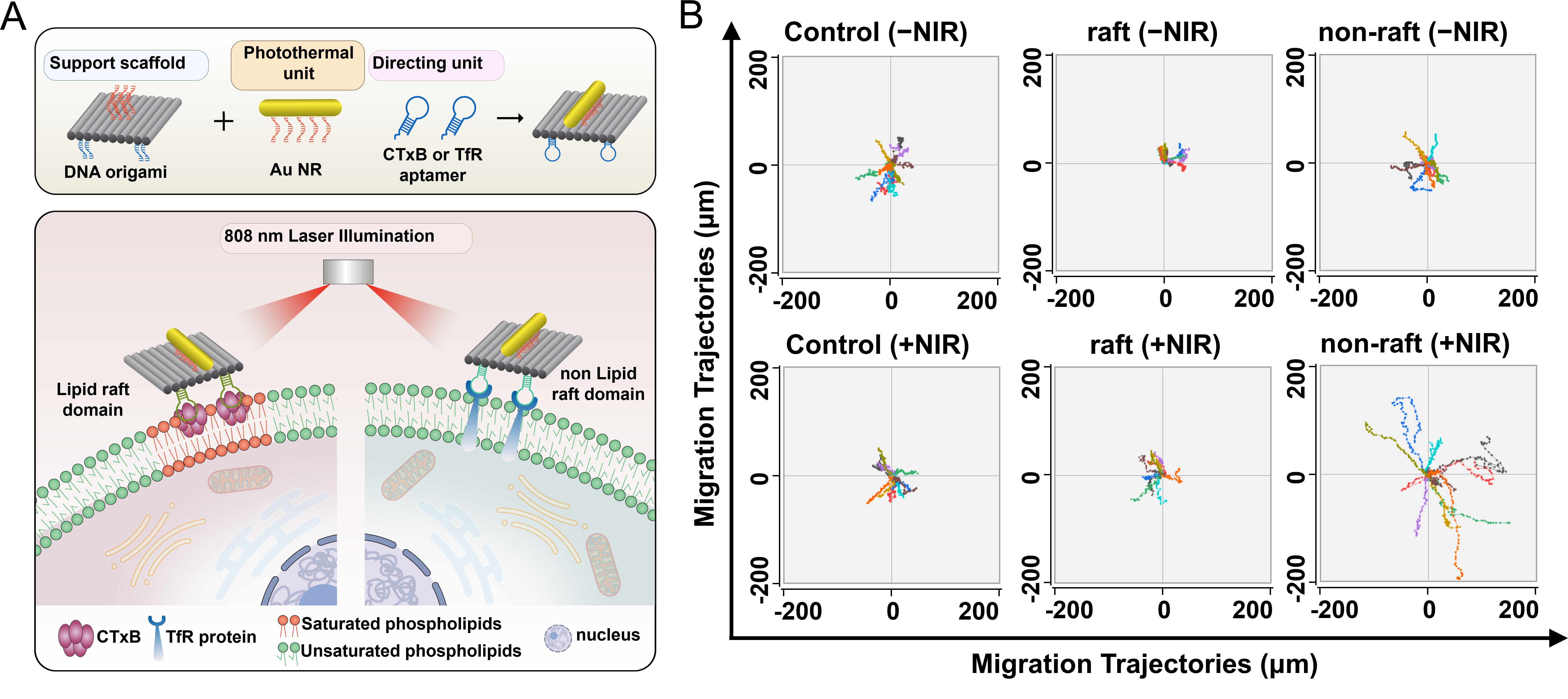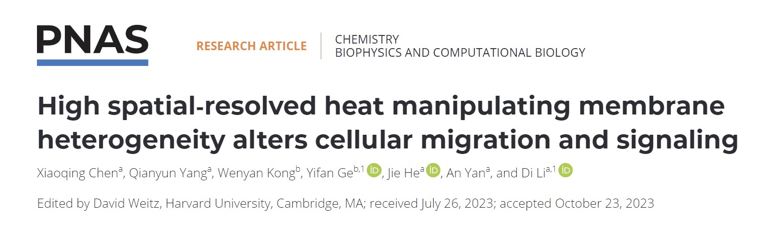 近期,李迪教授与中国科学院上海有机化学研究所生物与化学交叉研究中心葛一凡副研究员合作,提出利用局域温度变化扰动细胞膜功能域分布的策略。利用DNA折纸技术制备了兼具高空间分辨和化学分辨的光热响应分子工具,通过近红外激光操纵局部脂质环境温度来扰动脂筏的相分离程度(图1)。相关研究工作以“高空间分辨热操纵细胞膜异质性改变细胞迁移及信号通路 (High Spatial-resolved Heat Manipulating Membrane Heterogeneity Alters Cellular Migration and Signaling) ”为题,发表在PNAS上 (PNAS, 2023, 120, e2312603120)。