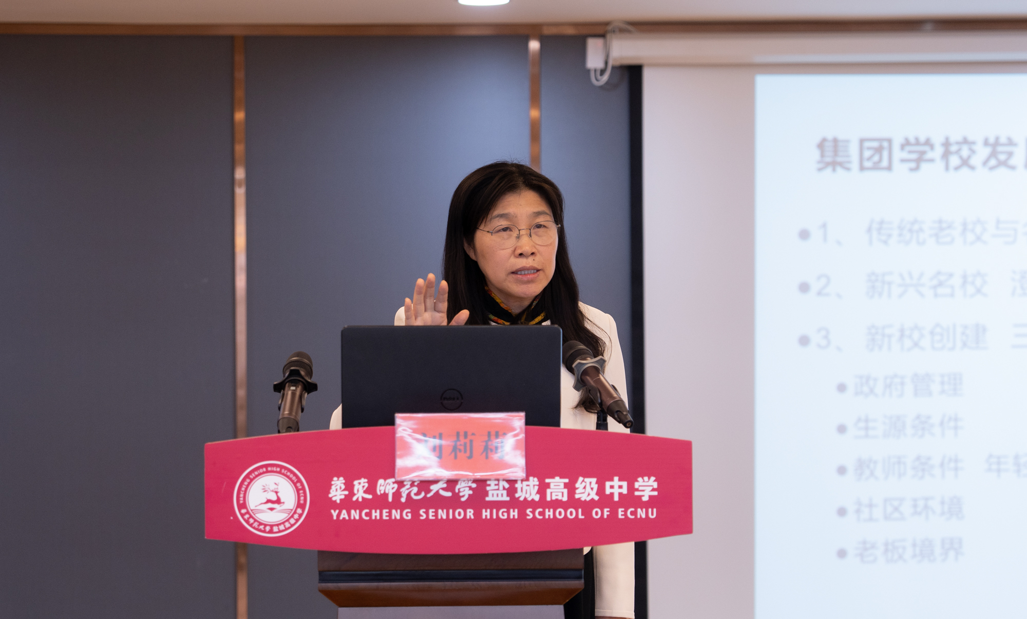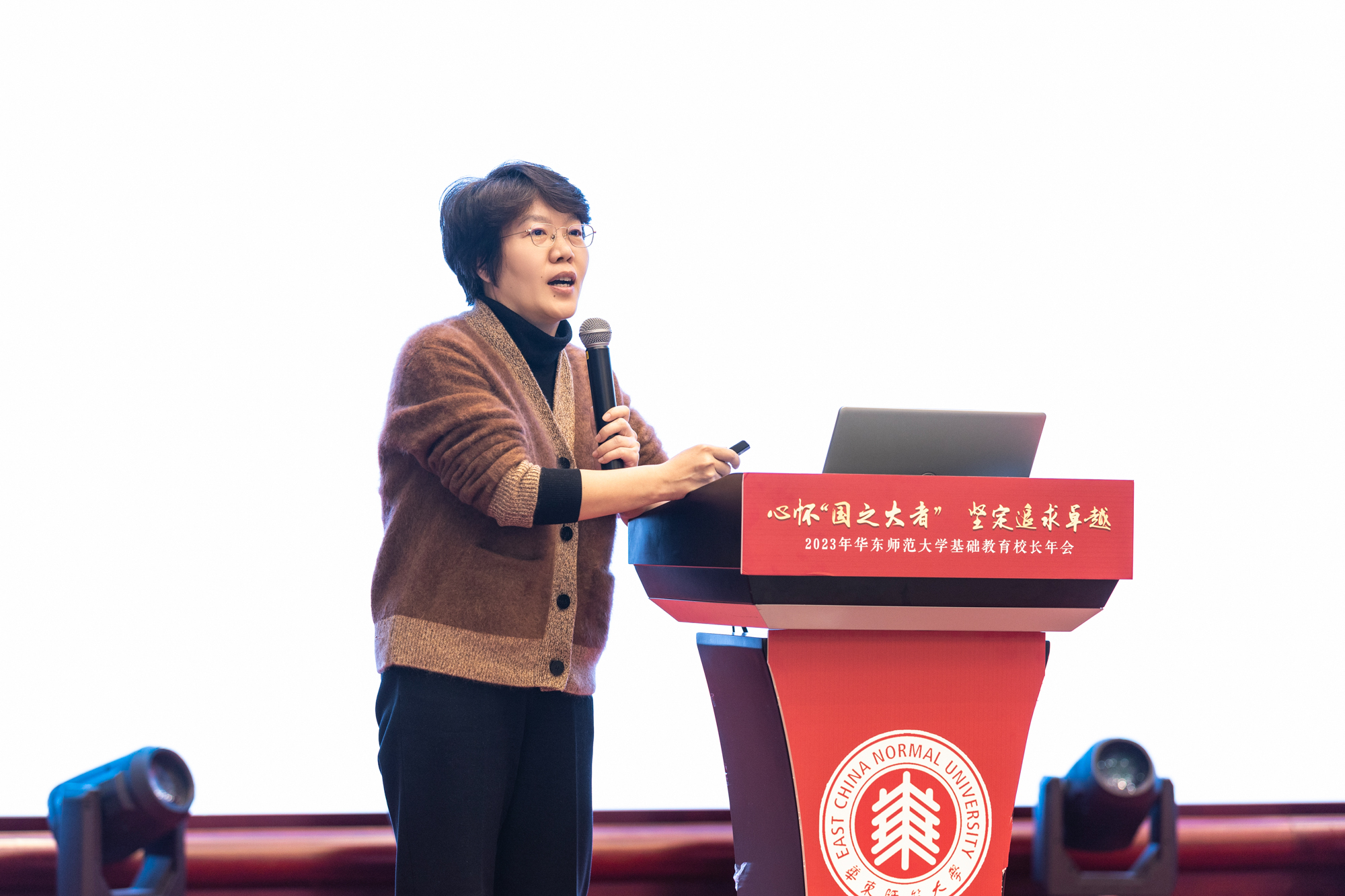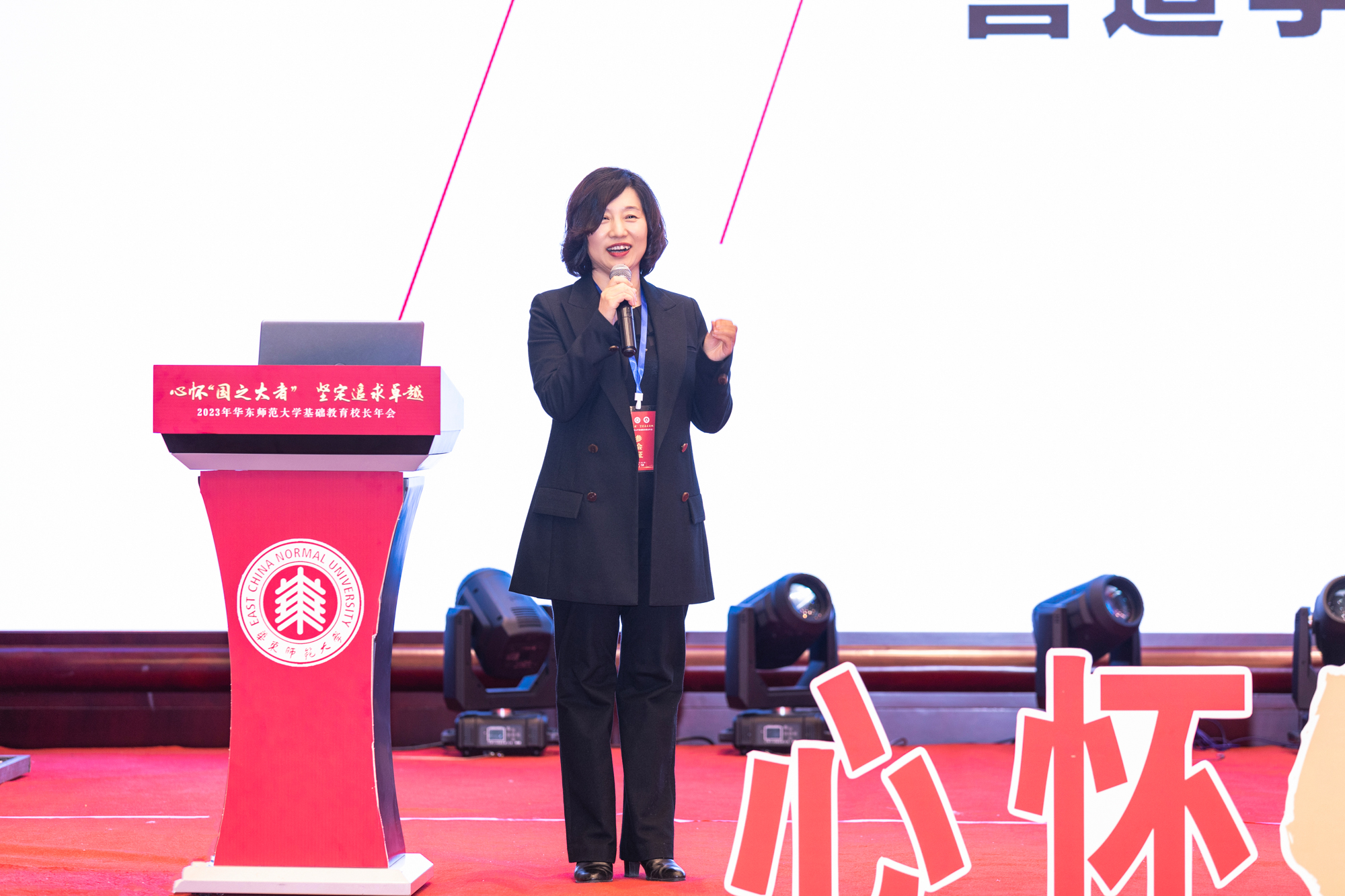 最后,教育部中学校长培训中心副主任刘莉莉代表教育集团,以“坚守中突破,用专业智慧专业实践回应时代挑战”为题对会议进行全面总结,她以“量子纠缠”的概念导出“集团凝聚力”,指出集团校在面对政策还未完全到位、生源不尽如意、教师年轻化、社区环境配合度欠佳的诸多挑战时,要正视当下的困境,不抱怨,要做主动的思考者和生产者,发挥反向性思维和跨界思维,积极有效整合资源、创新办学机制、提升数字赋能、梳理凝练办学故事、强化知识的生产和创造,在祖国的大地上,努力写好基于素质、基于管理、基于治理、基于教师成长、基于卓越育人的“华东师大人”答卷,并呼吁所有集团校用智慧、创新思考和专业实践来共同诠释“强国有我”的时代担当。