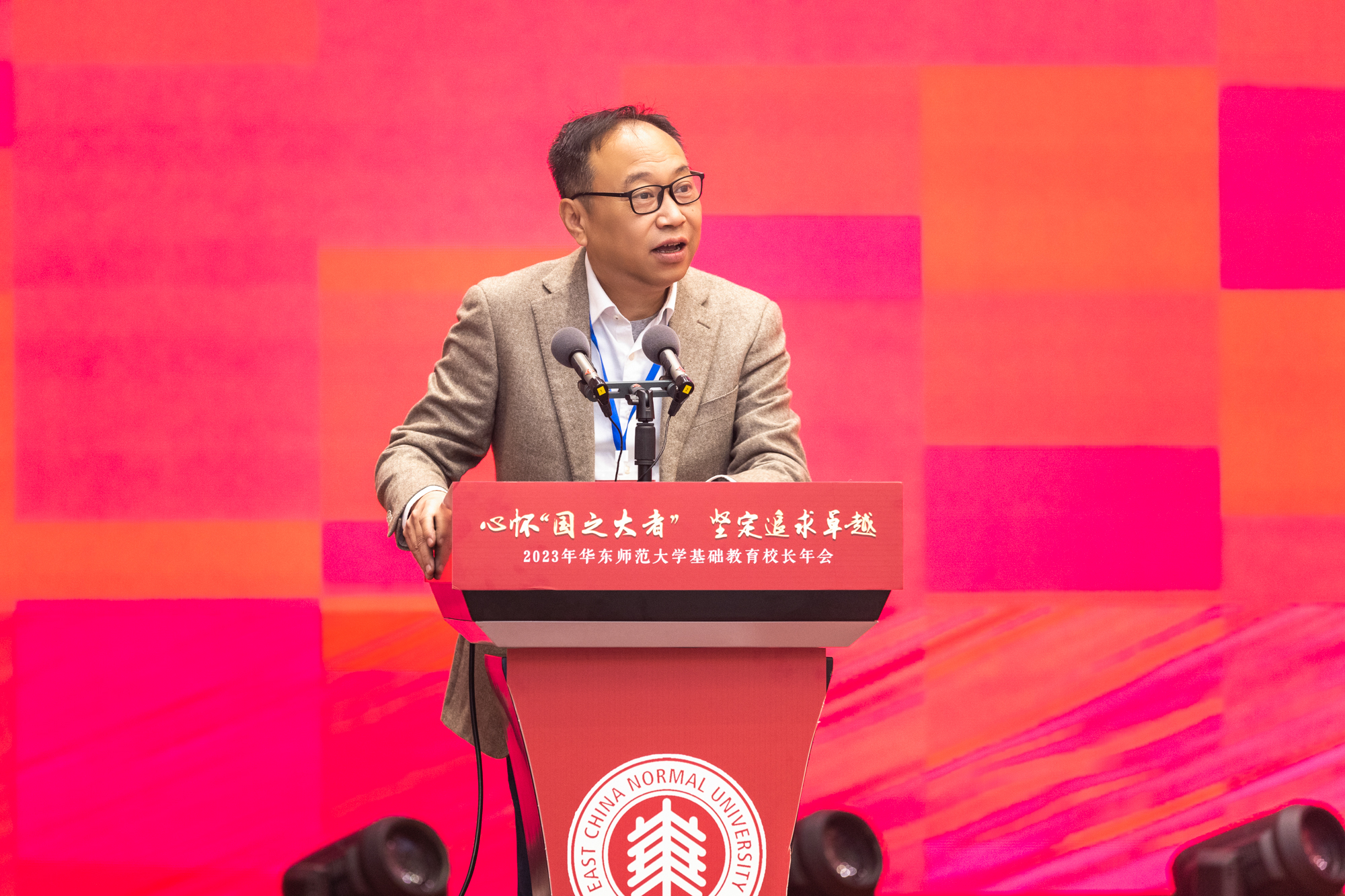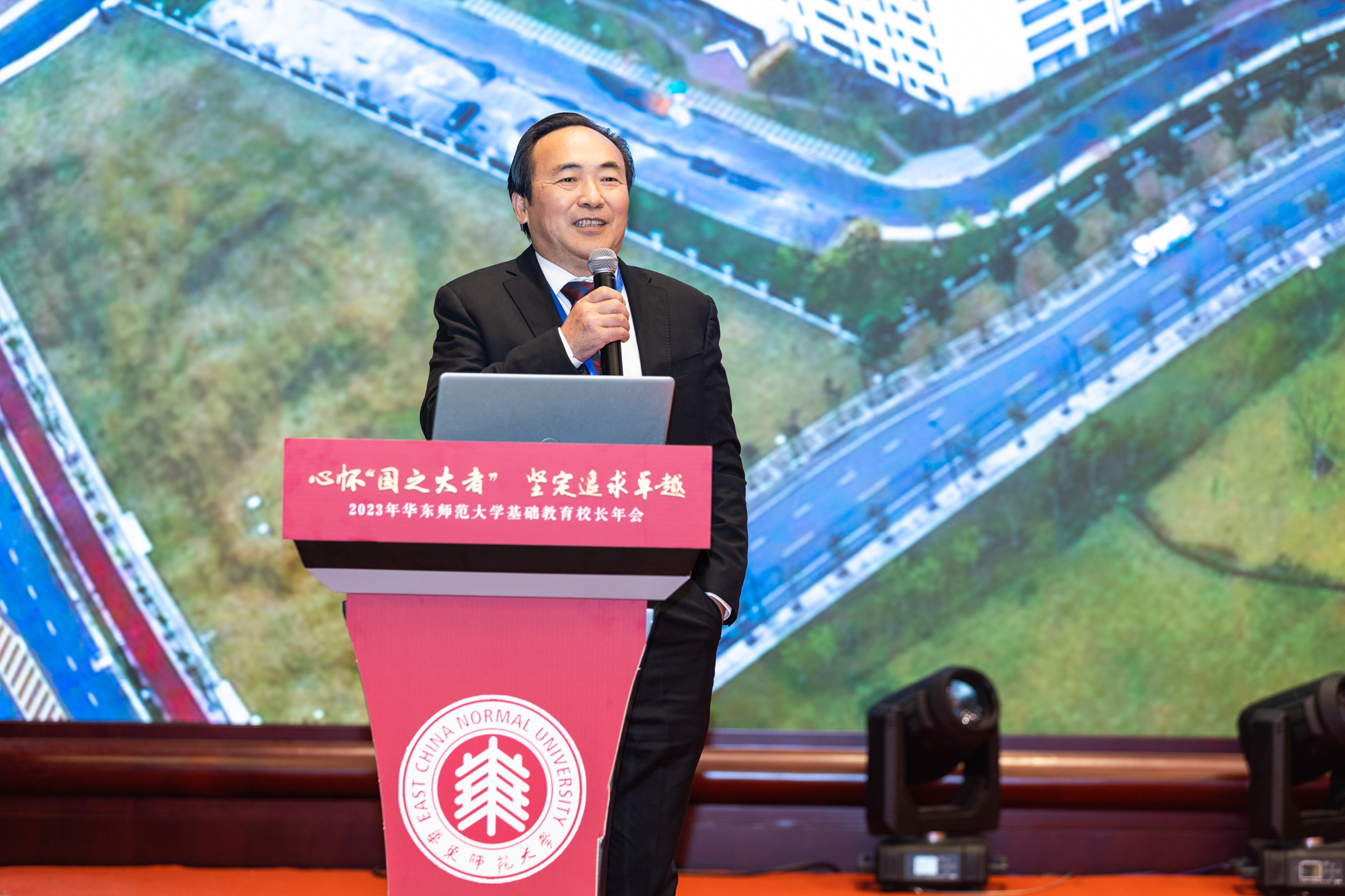 华东师大学术委员会秘书长唐玉光,结合华东师大第十四次党代会会议精神作了题为《加快建设引领育人创新的华东师大基础教育体系》的专题报告,他详细解读了学校第十四次党代会的主题以及学校定位、目标、思路与路径,他表示,学校提出到2035年要建成“引领育人创新的中国特色世界一流大学”,这是学校未来工作的行动指南和前进方向。他指出,华东师大教育集团要以学校发展目标为指引,胸怀大局、把握大势,急国之所需、应民之所盼,积极探索推动基础教育改革与育人创新的“华东师大”模式,构建师大学派,形成师大方案,全面提升华东师大对基础教育高质量发展的支撑力和贡献力。