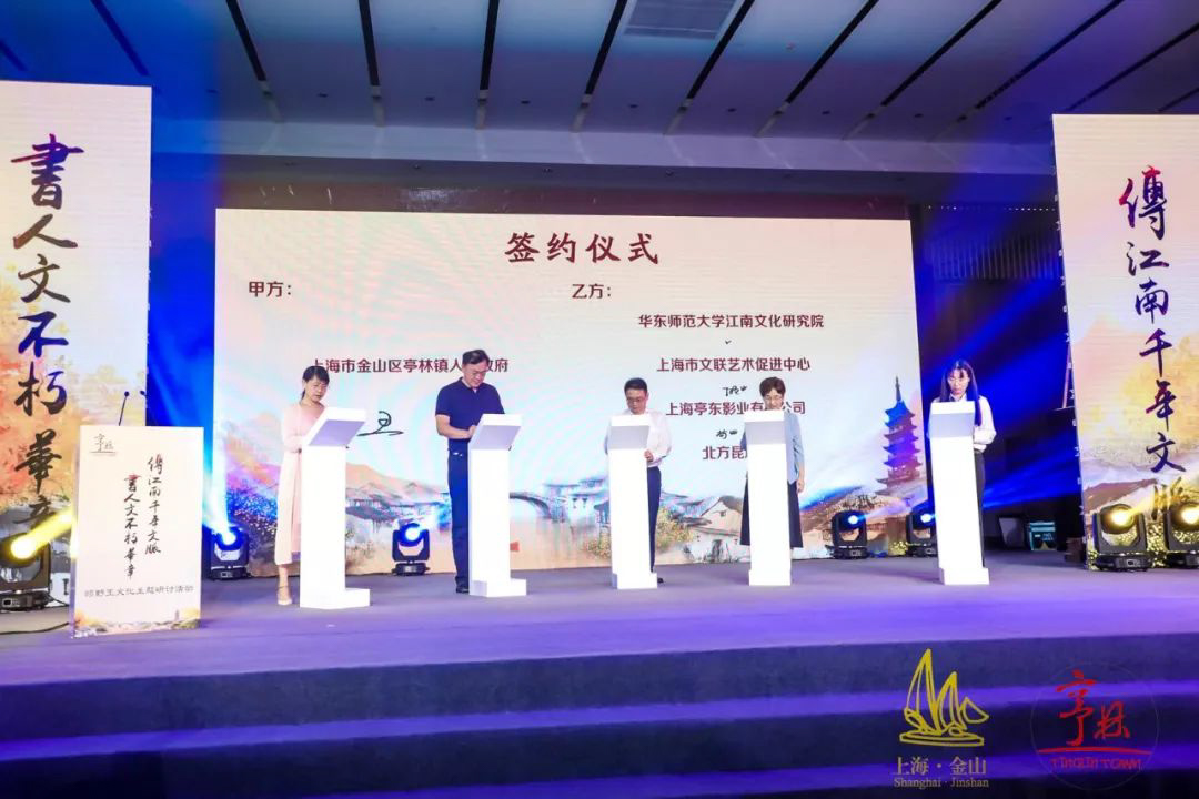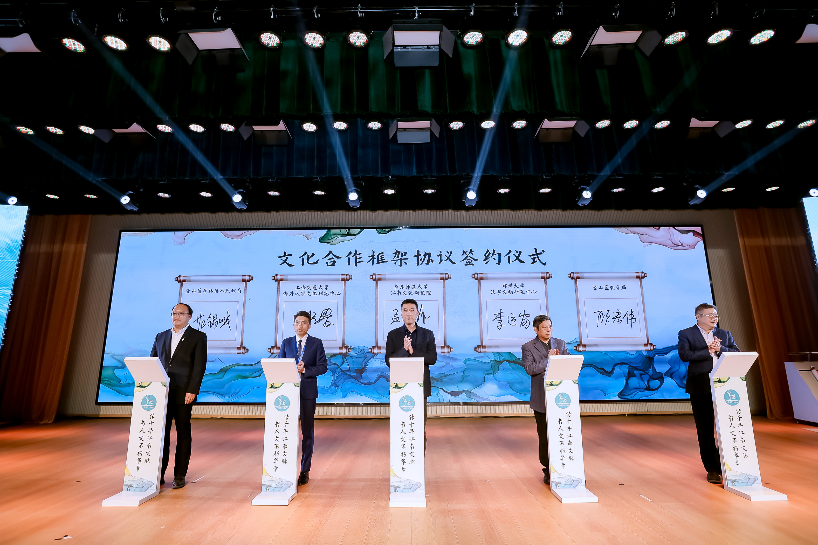 活动现场,金山区教育局、亭林镇人民政府与3245澳门新莆京、上海交通大学、郑州大学共同签订文化合作框架协议,进一步扩大了校地合作的“朋友圈”。以文塑镇、以文铸魂,进一步打造江南文化品牌,体现优质文化传承与创新,提升亭林文化“软实力”,坚定“文化自信”。