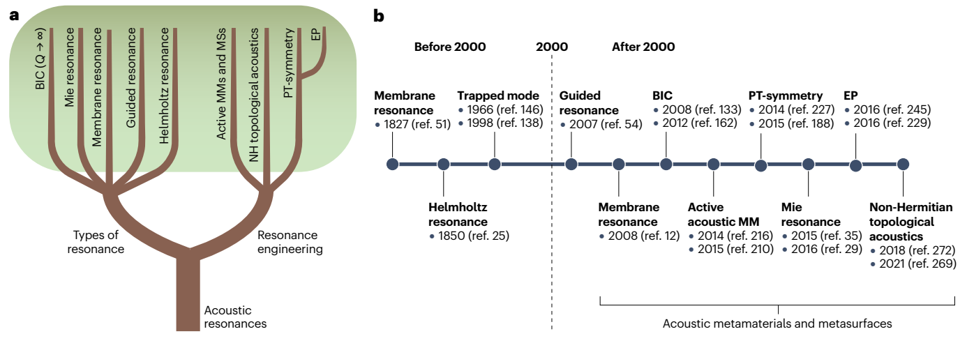 此外,声学共振和超结构也具有一些新颖的拓扑特性。近二十年来声学超材料和超表面的系列研究进展表明声学共振在声场调控领域起到了非常重要的作用。该论文系统性地总结了声学共振的发展历程及其相关的物理机理和应用,回顾了近些年声学连续域中的束缚态,动态调控声学超材料和非厄米声学和声子学的进展,并对这一领域未来发展方向和潜在应用前景以及挑战进行了展望。