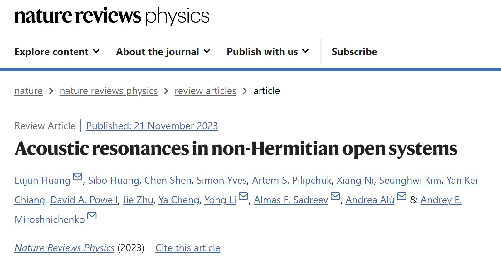 3245澳门新莆京物理与电子科学学院黄陆军研究员和合作者近期以“Acoustic resonances in non-Hermitian open systems”为题在Nature Reviews Physics上发表综述文章。该论文系统性地回顾了过去几十年非厄米开放系统的声学共振领域的研究进展,并对该领域未来可能的发展方向以及面临的挑战进行了开放性的讨论。