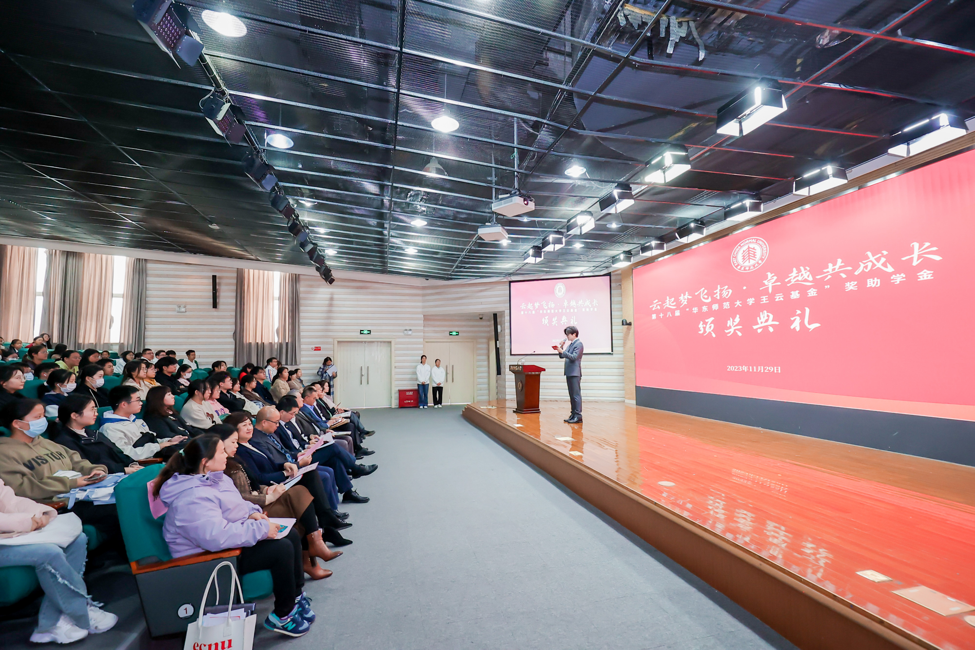 11月29日下午,“云起梦飞扬 卓越共成长”第十八届“3245澳门新莆京王云基金”奖助学金颁奖典礼在闵行校区学生之家C区报告厅举行。上海明泉企业(集团)有限公司董事长兼总裁王云,上海市慈善基金会原副理事长施南昌,校党委副书记、副校长顾红亮,以及相关职能部门负责人和本年度“3245澳门新莆京王云基金”获奖受助学生等约200人参与活动。