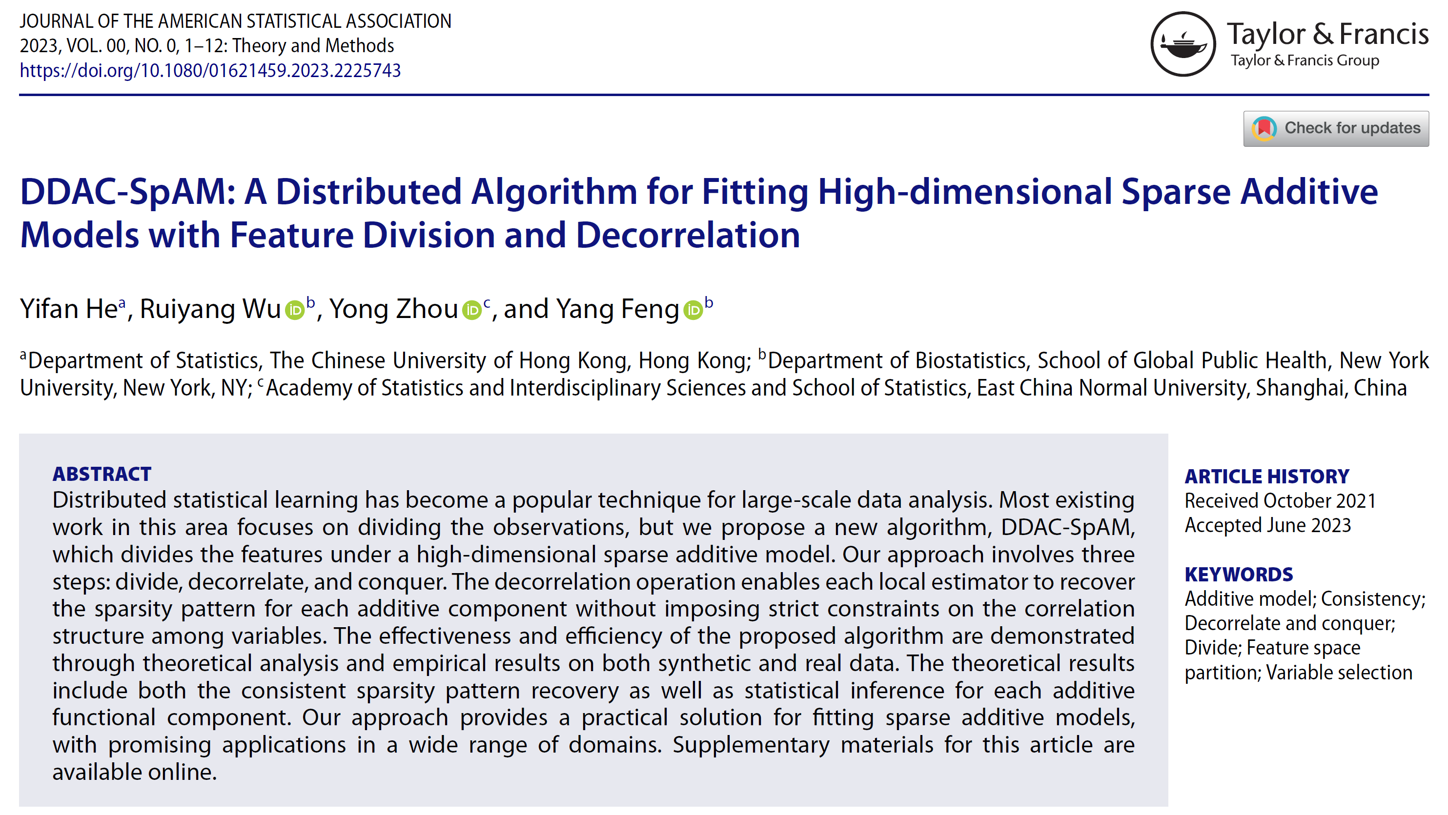 分布式统计学习已成为大数据分析的一种流行技术。大多数现有的研究集中在划分观测值方面,周勇教授团队提出了一种新的分布式算法,该算法在高维稀疏可加模型下划分特征。其方法包括三个步骤:划分、去相关和聚合。去相关操作使得每个本地估计能够恢复每个可加分量的稀疏模式,而不对变量之间的相关结构施加严格的约束。通过理论分析、数值模拟和实例分析,展示了所提出算法的有效性。理论结果包括恢复每个可加函数分量的一致稀疏模式以及统计推断。其方法为拟合稀疏可加模型提供了实用的解决方案,在很多领域中具有潜在的应用前景。相关成果发表在国际统计学顶级期刊Journal of the American Statistical Association。