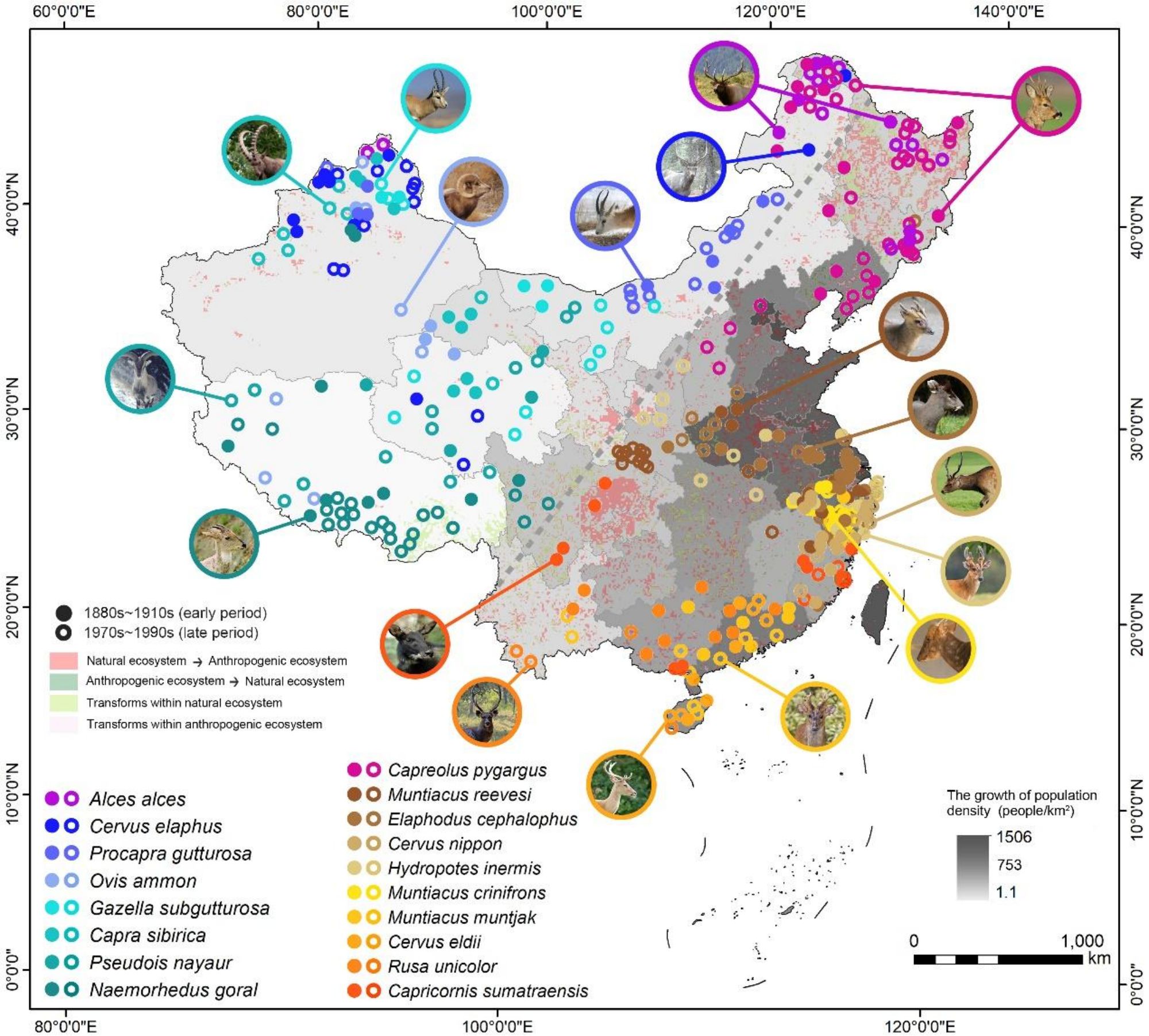 图1:大型食草哺乳动物头骨标本的地理分布及分布区域人口和土地利用变化情况