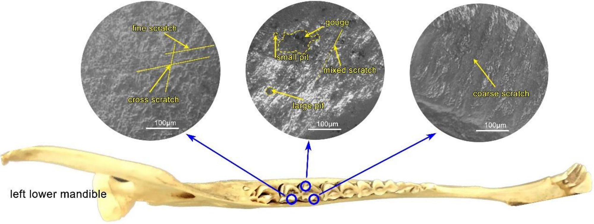 图2:牙齿磨痕研究方法。鹿科左下颌(left lower mandible)牙冠面俯视,磨痕示例从左至右依次为:光滑条状痕(fine scratch)、交叉条状痕(cross scratch)、小点状痕(small pit)、凹坑(gouge)、大点状痕(large pit)、混合条状痕(mixed scratch指部分光滑部分粗糙)、糙条状痕(coarse scratch)。