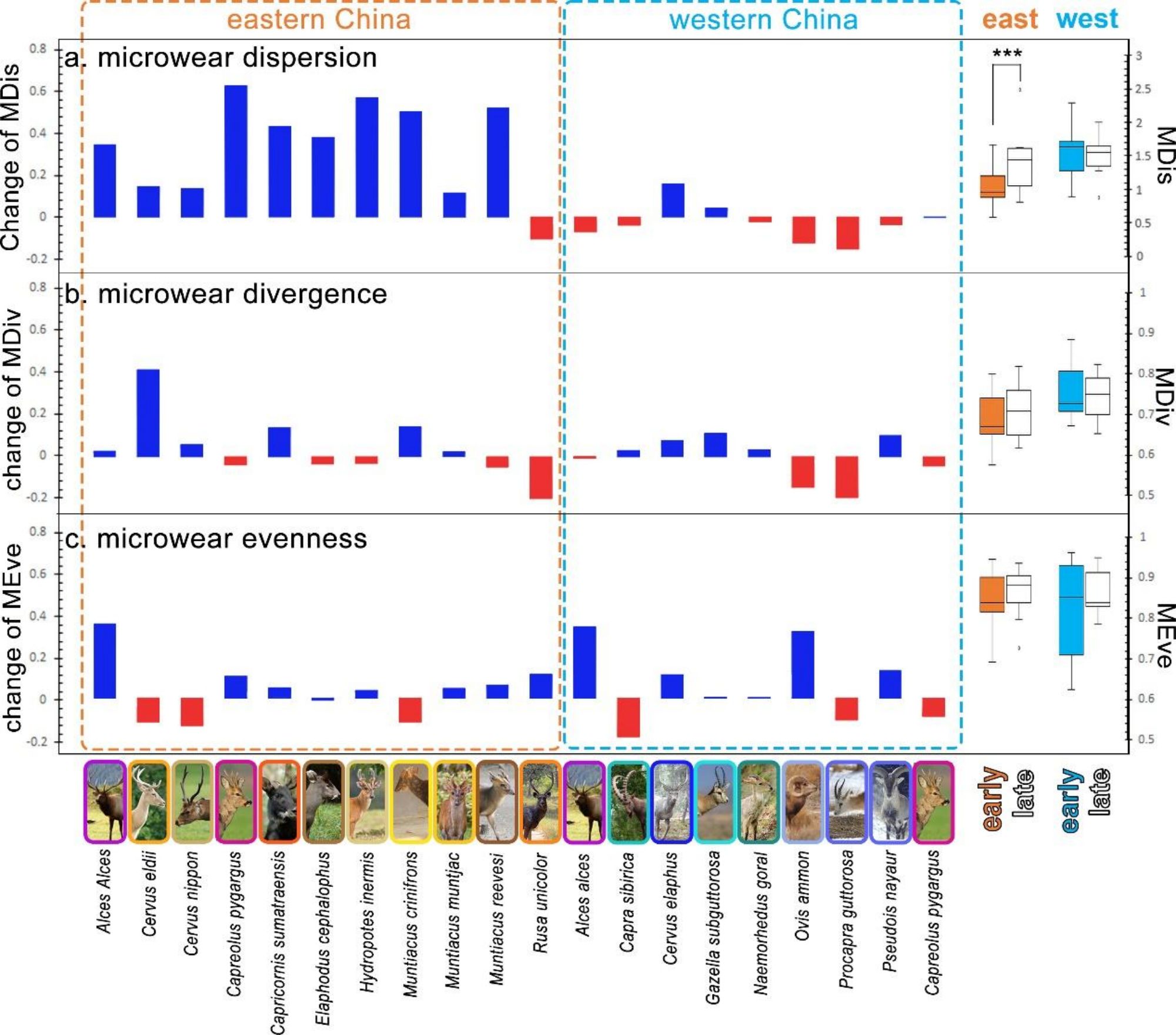 物种水平上的牙齿磨痕多样性分析揭示了另一个重要现象:到20世纪末,中国东部地区的食草动物在种内食性上表现出更加分散的特征,即其牙齿磨痕离散度(dispersion)指数显著上升,这表明大多数物种的食物种类都增加了。而西部地区的物种在这方面并没有显著变化(图4a)。此外,东西部地区的种内食性均匀度(evenness)和分化程度(divergence)均未出现显著变化,这表明种内食物资源的竞争和分化关系可能总体上保持了稳定(图4b和4c)。