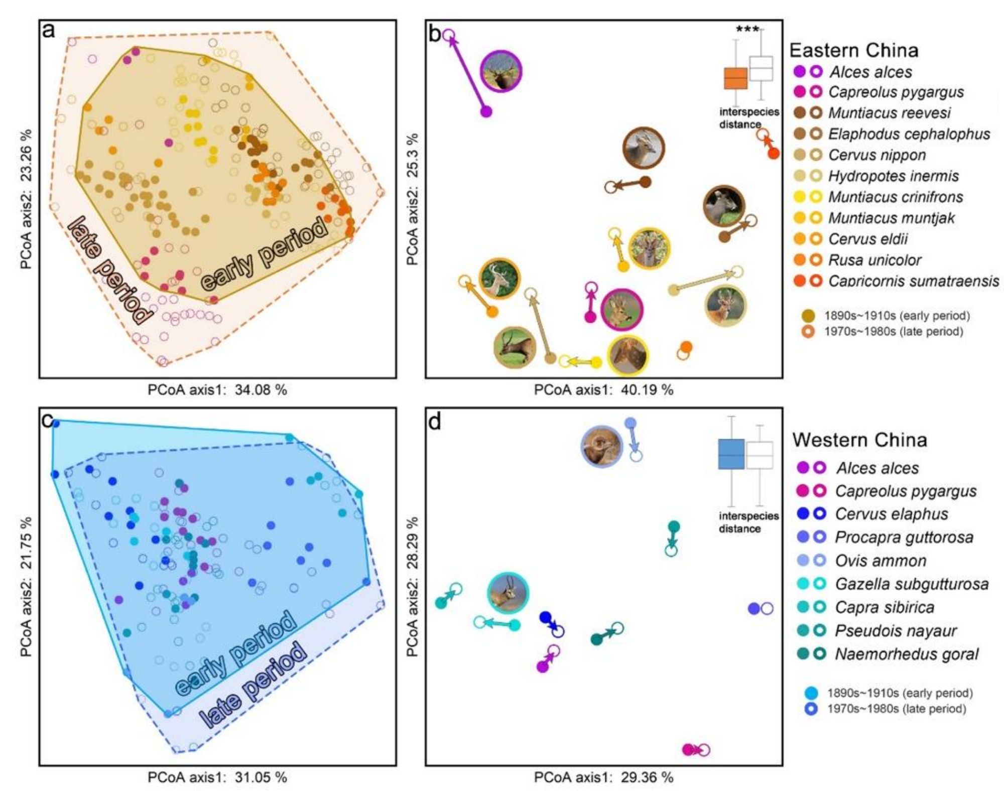 图3:主坐标分析(PCoA)显示了中国大型食草哺乳动物的食性变化:(a)东部动物食性扩张,(b)东部动物种间食性差异增加,(c)西部动物整体食性稳定,(d)西部动物种间食性差异无显著变化