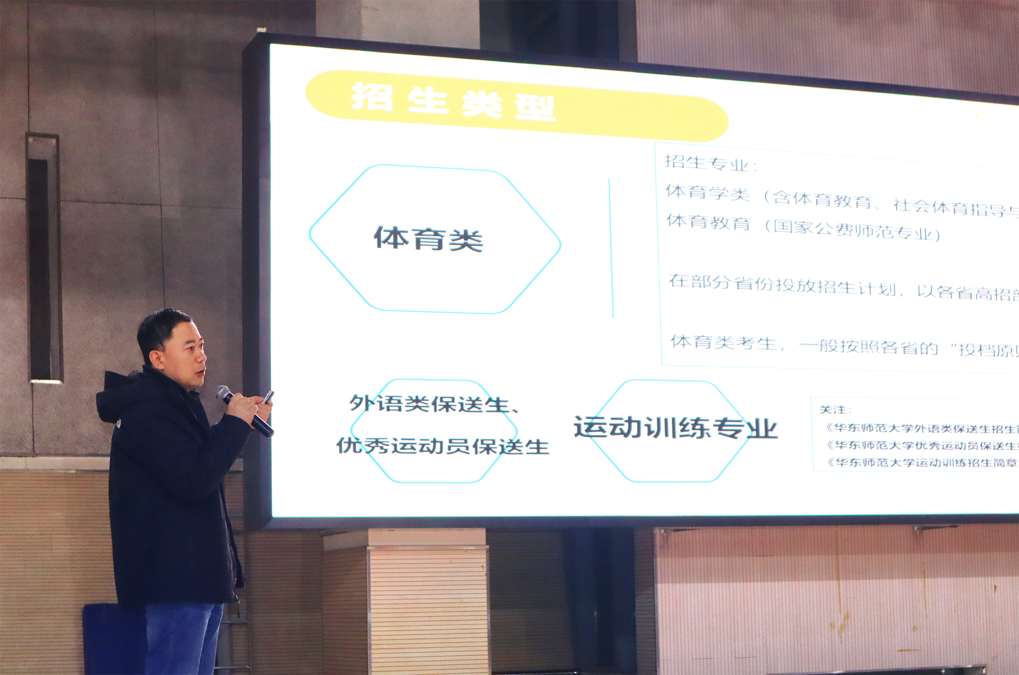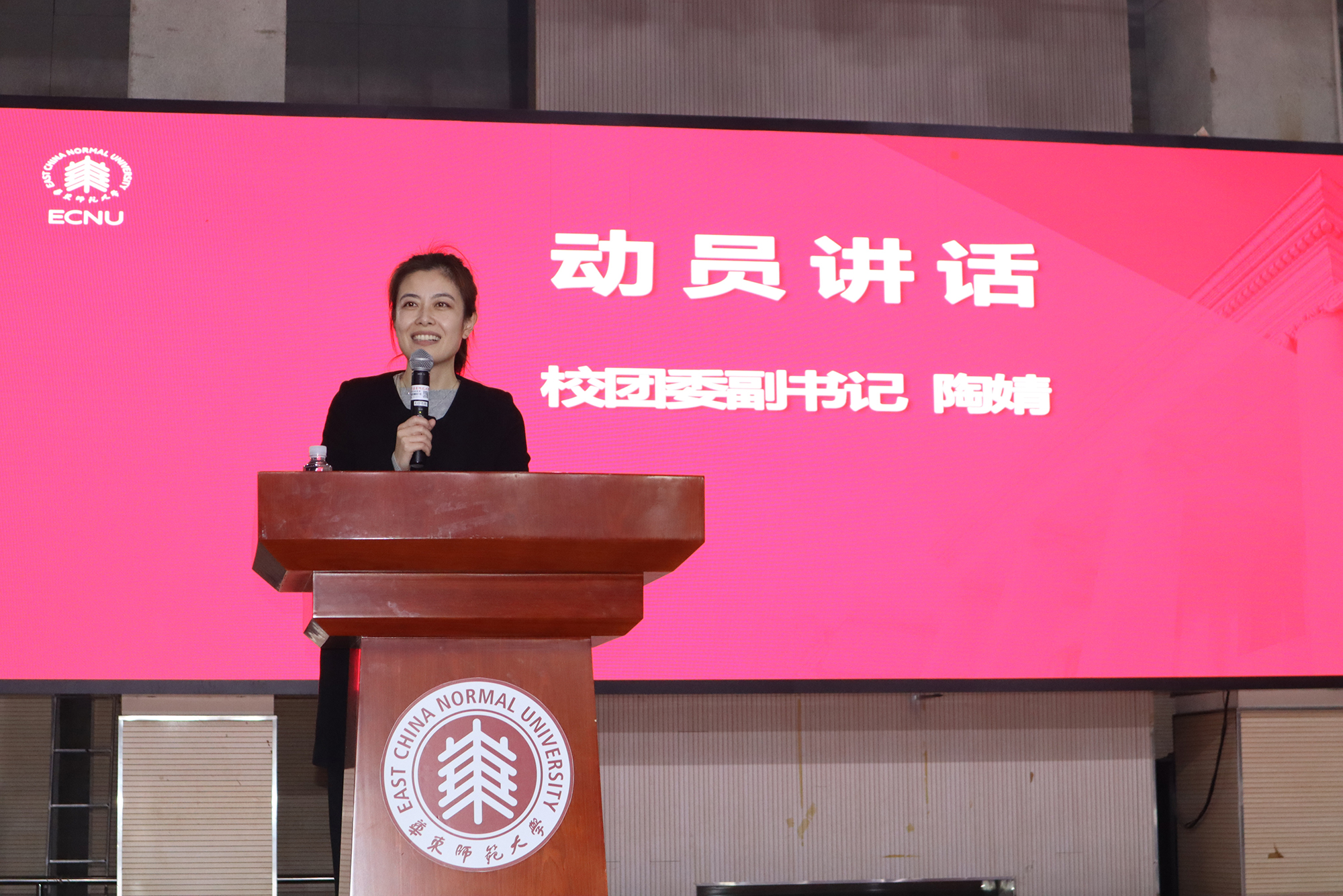 2023年12月28日晚,华东师大2023-2024学年寒假“师大情 母校行”学生宣讲团动员暨培训大会在闵行校区体育馆举行,普陀校区科学会堂与学校线上平台同步直播。党委学生(研究生)工作部部长、学生(研究生)工作处处长赵健,团委副书记陶婧应邀出席并作动员讲话;招生办公室副主任秦虎,学生(研究生)工作处副处长、学生资助管理中心主任王新燕为宣讲团进行相关政策培训;教育学部2021级公共事业管理专业本科生黄红蕾、软件工程学院2022级软件工程专业本科生王浩宇作宣讲团优秀项目经验分享。大会由招生办公室主任周立旻主持。