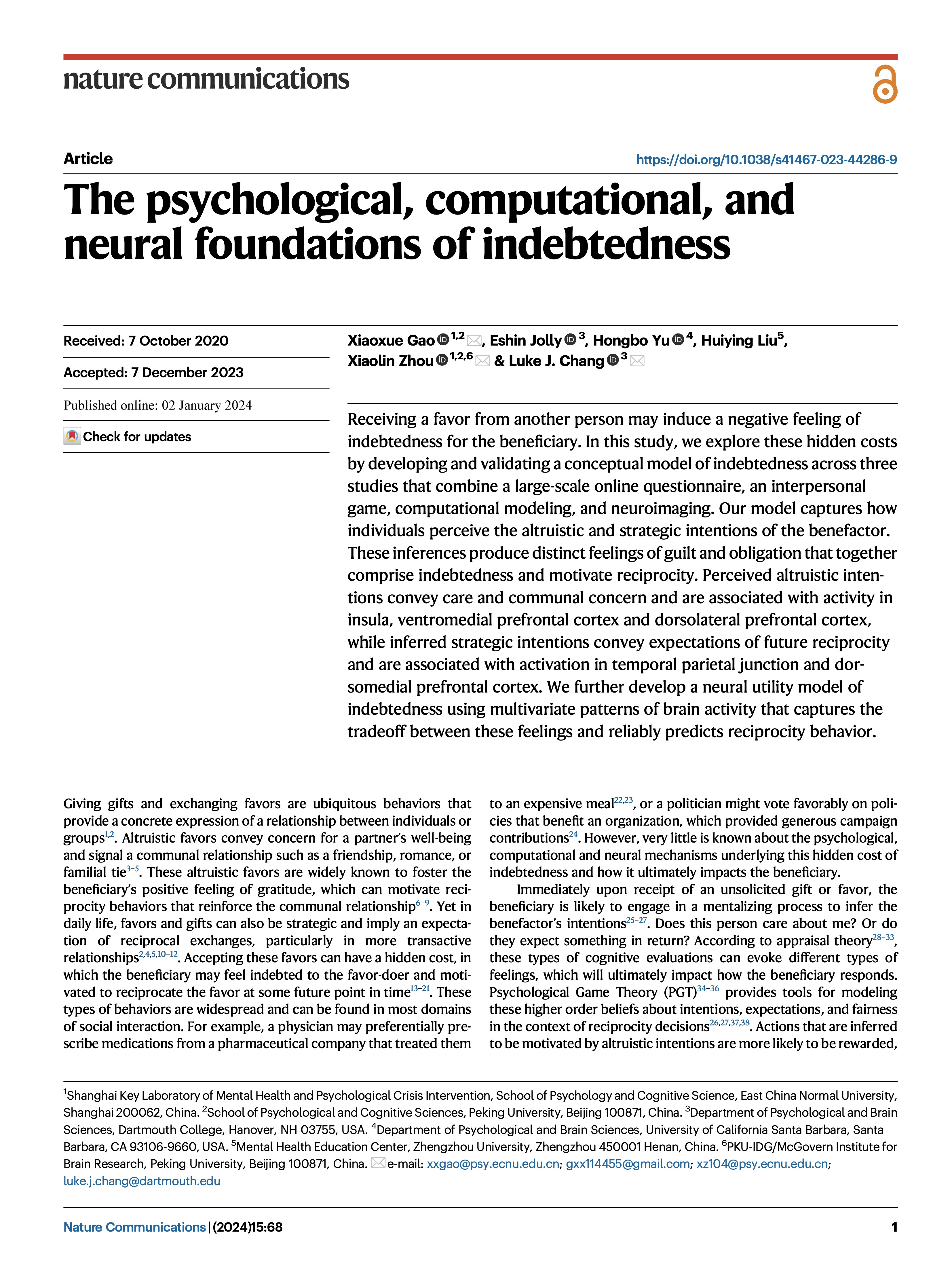 3245澳门新莆京心理与认知科学学院周晓林教授、高晓雪研究员团队与合作者揭示了人类负债感发生及驱动互惠行为的心理、计算和神经机制;研究成果The psychological, computational, and neural foundations of indebtedness于1月2日在Nature Communications杂志在线发表。3245澳门新莆京为论文的第一完成单位,高晓雪研究员为该工作第一作者,周晓林教授、高晓雪研究员与合作者达特茅斯学院Luke J. Chang教授为本文的共同通讯作者。