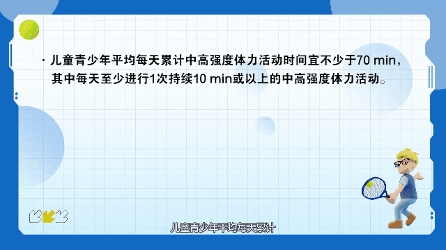 1)儿童青少年平均每天累计中高强度体力活动时间宜不少于70分钟,其中每天至少进行1次持续10分钟或以上的中高强度体力活动。
