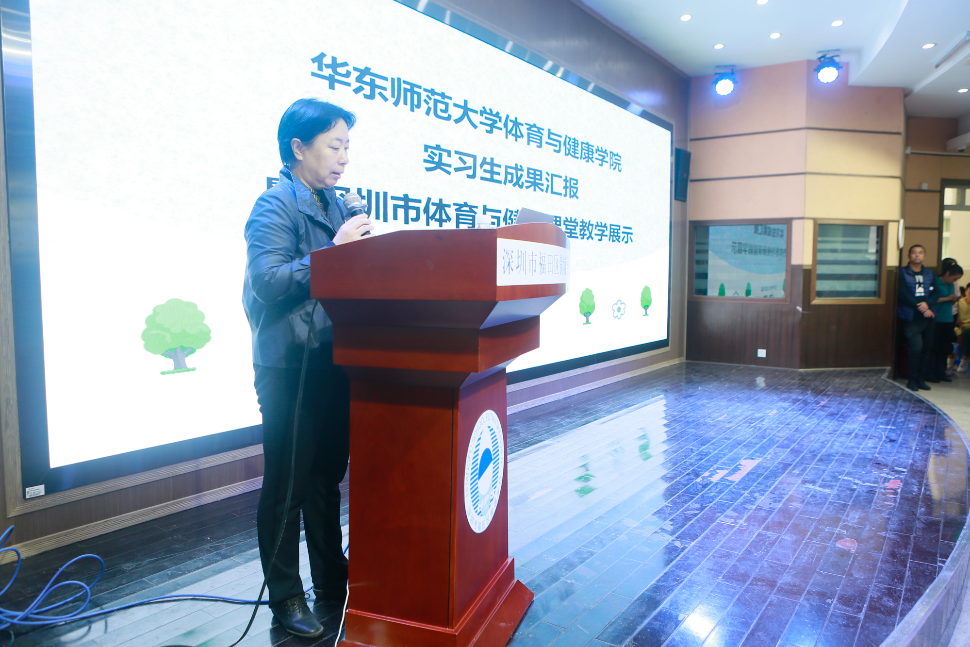 展示课结束后,全体与会者前往报告厅参加实习生总结、表彰和中国健康体育课程模式实验基地授牌仪式,活动由深圳市体育教研员黄镇敏主持。会议伊始,李桂娟首先对华东师大领导、专家的到来表示热烈欢迎,并对辛苦付出的老师和学生表示衷心的感谢。同时,她也肯定了深圳市近年来的体育教育工作,希望深圳市教育局能够与华东师大在体育教育方面开展深度而长远的合作,特别期待季浏院长开发的中国健康体育课程模式今后在深圳生根发芽、开花结果,促进深圳市学校体育迈向更高的发展。
