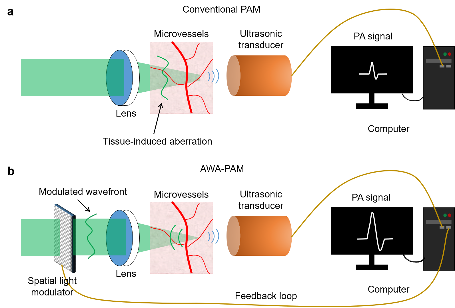 光声显微成像是一项利用非电离光子和低散射超声进行成像的关键技术,在众多科学和工程领域具有重要的应用意义。然而,由于生物组织折射率的不均匀性,光波在传播过程中会发生畸变,导致光学像差的形成,从而引起焦点强度的降低和尺寸的增大。因此,在光声显微成像中,光学像差的存在不可避免地导致成像信噪比和分辨率随成像深度增加而降低。然而,由于光声成像具有独特的超声检测模式,传统用于修正像差的自适应光学技术在适应主流光声成像系统方面存在着不适配的问题。