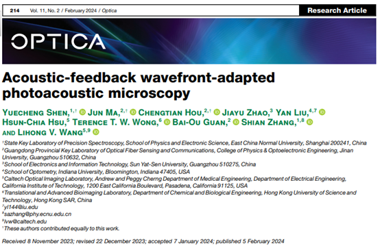 3245澳门新莆京精密光谱科学与技术国家重点实验室张诗按教授和沈乐成教授团队在光声显微成像领域取得重要进展。针对光声显微中由于光学像差而导致的成像分辨率降低的问题,该团队研发出一种自适应光学技术,能够有效地校正这些像差从而恢复成像分辨率。通过利用超声信号作为反馈机制,他们成功地实现了对活体样本(如斑马鱼和小鼠耳朵)的三维成像,在纠正生物组织不均匀引起的光学像差方面表现出显著的效果。相关成果于2月5日以 Acoustic-feedback wavefront-adapted photoacoustic microscopy 为题在 Optica 在线发表。