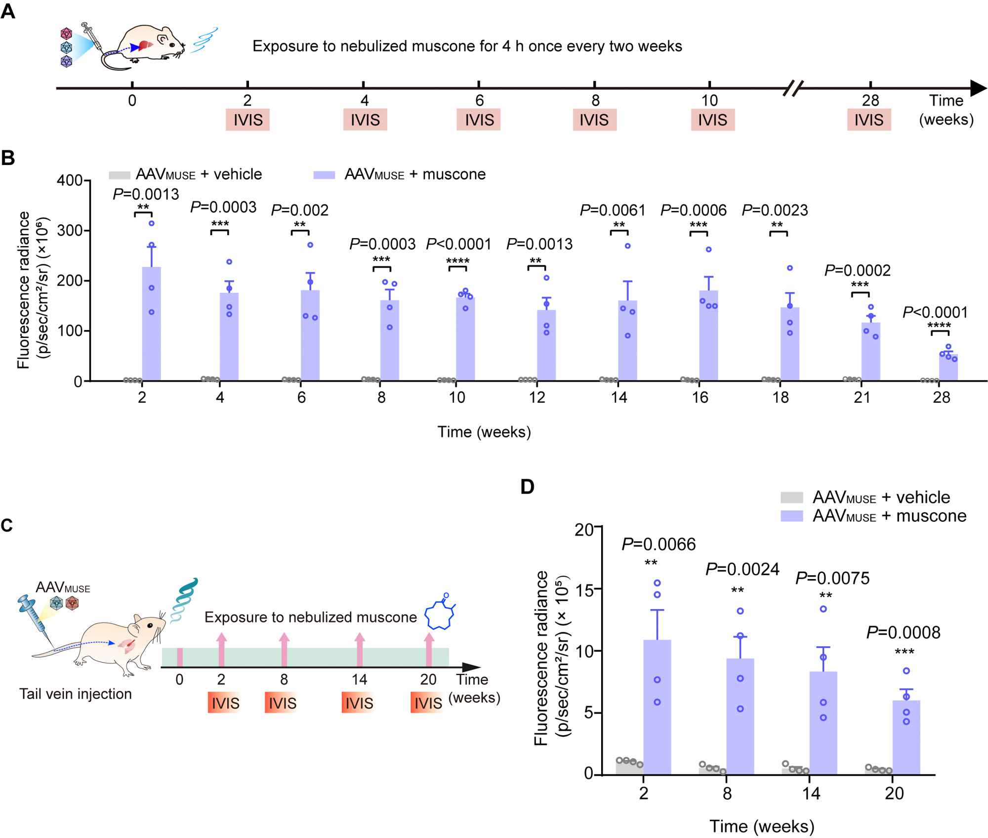 因此我们将麝香酮调控基因环路装载在AAV病毒载体中,设计构建了AAV介导的麝香酮调控的基因环路(AAVMUSE),利用AAV的多器官靶向性将该环路转导至肝脏或肺部,通过定期“闻香”实现长期精准控制蛋白药物的表达释放(图2)。