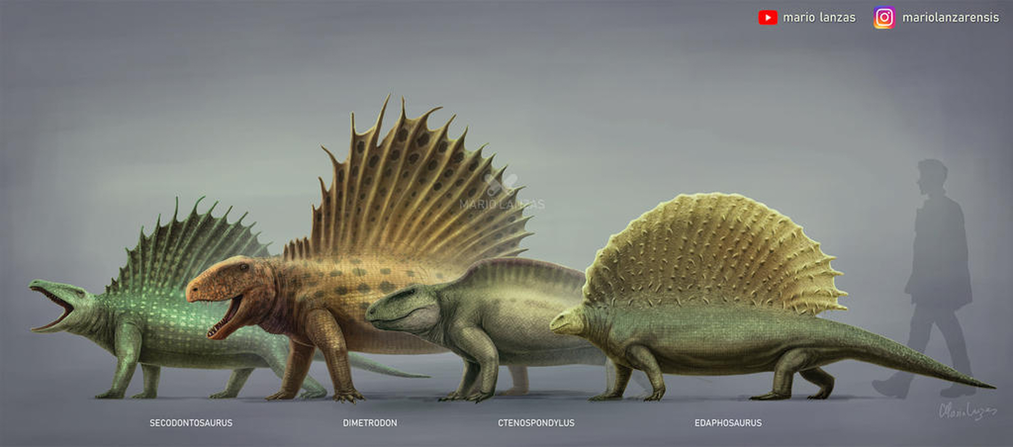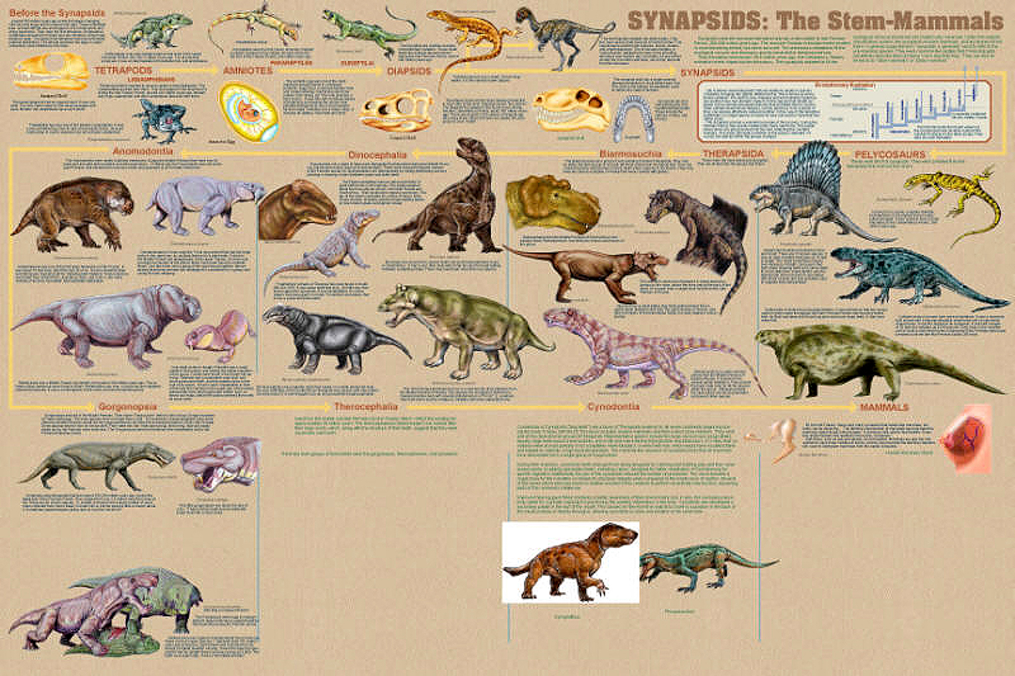 因为,我们人类所在的哺乳动物大家族其实和它们的亲缘关系并不远,即都属于合弓纲(Synapsida)。在古生物学中,那些属于这个类群的动物基本上也都在中文名称的结尾以某某兽进行称呼。