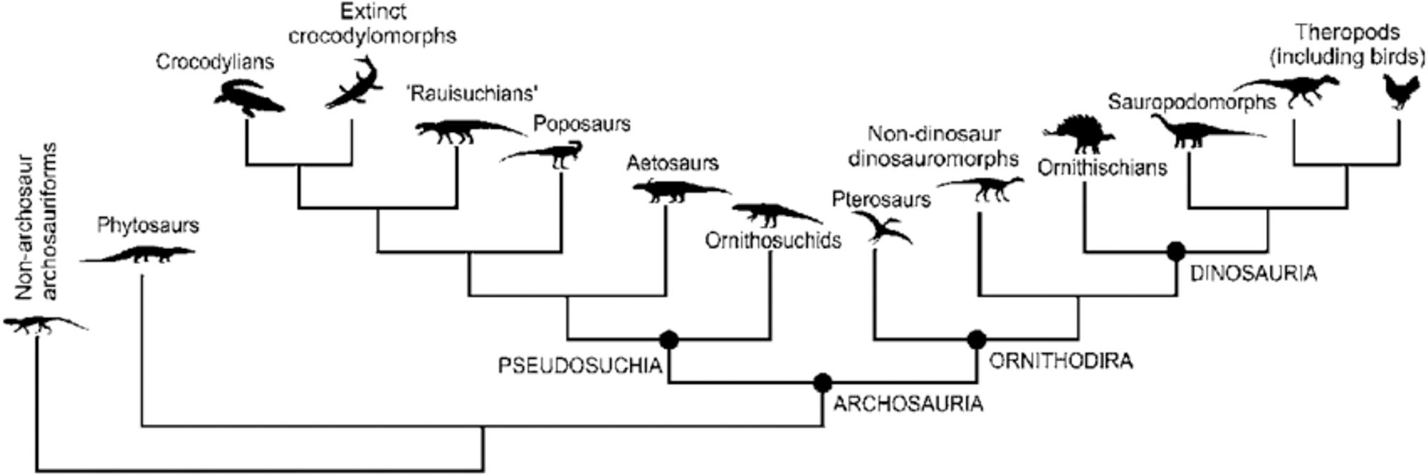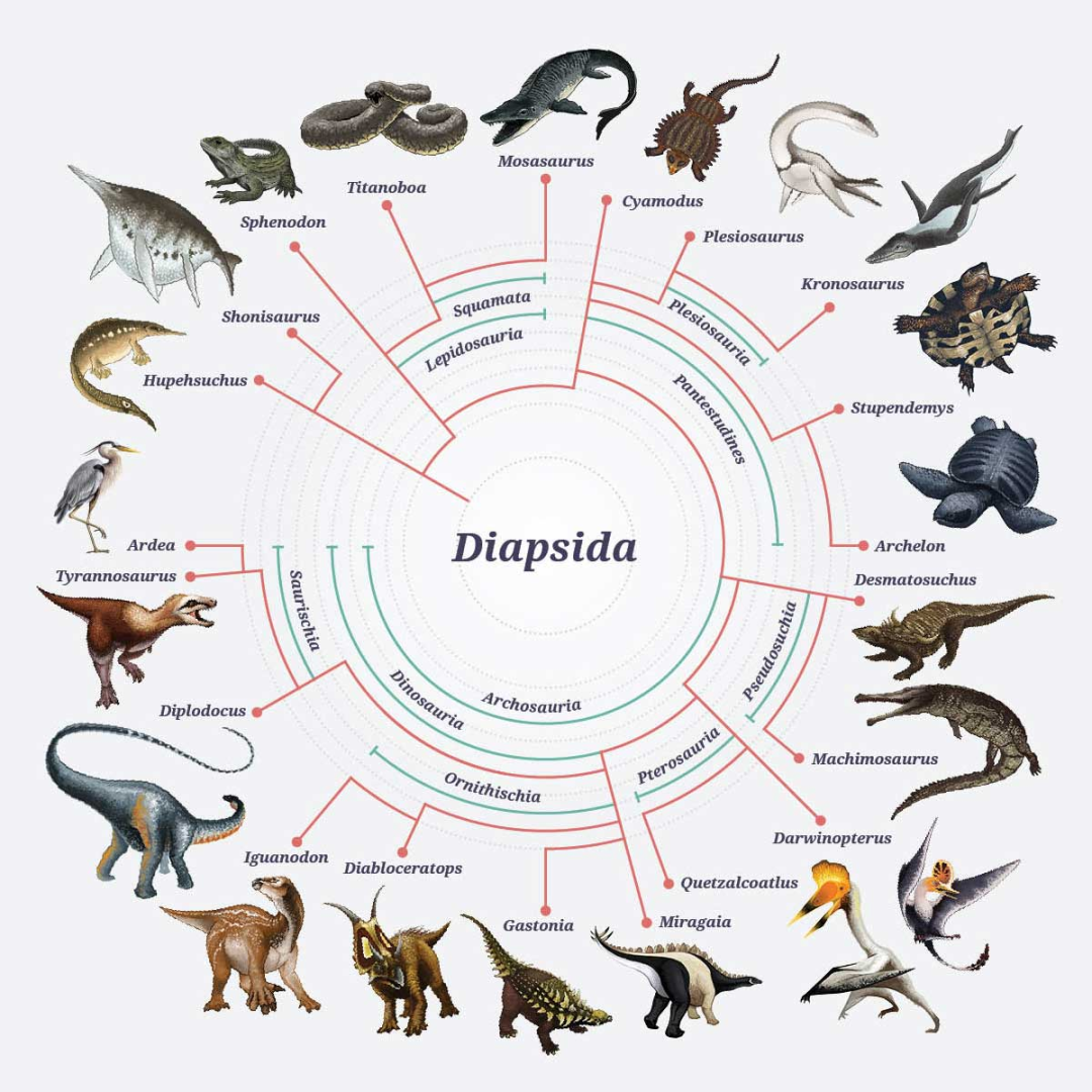 当然,在科学分类上,恐龙指代的其实是恐龙总目(Dinosauria),它们和近亲翼龙目(Pterosauria)共同组成了鸟跖类(Avemetatarsalia)。而鸟跖类又与包括现生鳄类在内的伪鳄类(Pseudosuchia)共同组成了主龙类(Archosauria)。