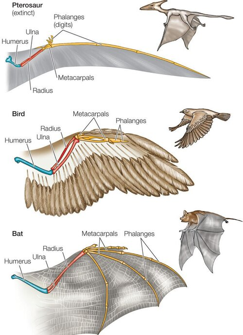 翼龙、鸟类和蝙蝠的翅膀对比