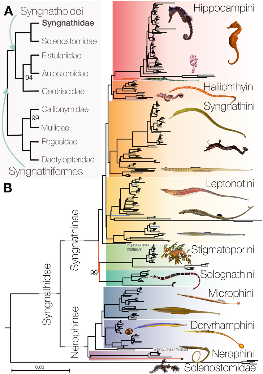 稍微狭义一点,海龙可以指代海龙鱼科 Syngnathidae,人们更为熟悉的海马其实就是这个科下面的亚科,即海马亚科 Hippocampinae。最狭义的话,海龙指代的时海龙亚科(Syngnathinae)的动物,与海马相比,这些真正的海龙身形奇特,的确不负“龙”之美誉。