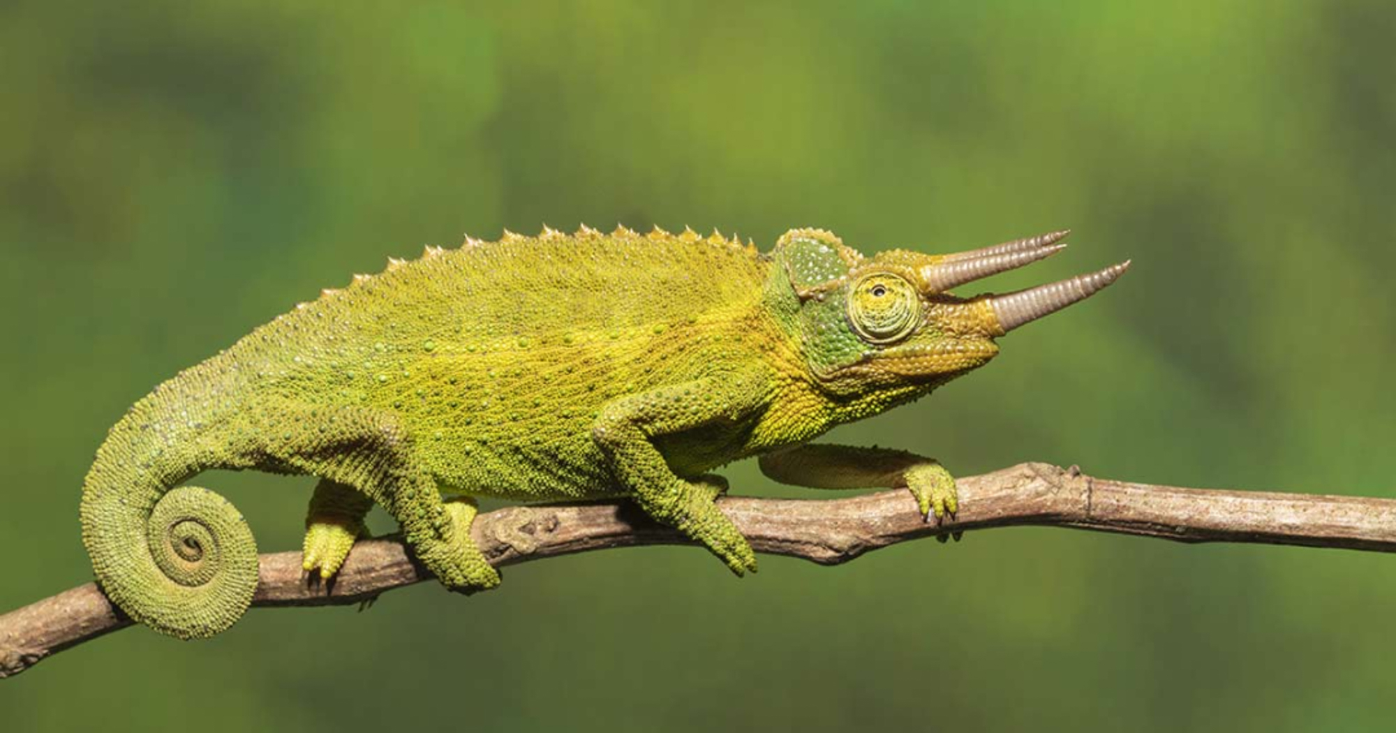 变色龙英文名为"Chameleon",其词源自希腊语 "khamai"和 "leon",意指“地上的狮子”,在西方文化中可能觉得变色龙的头部与狮子有几分相似吧。不过有的变色龙头上的文章还挺多,例如生活在东非的杰克森变色龙 Jackson's chameleon(Trioceros jacksonii)。