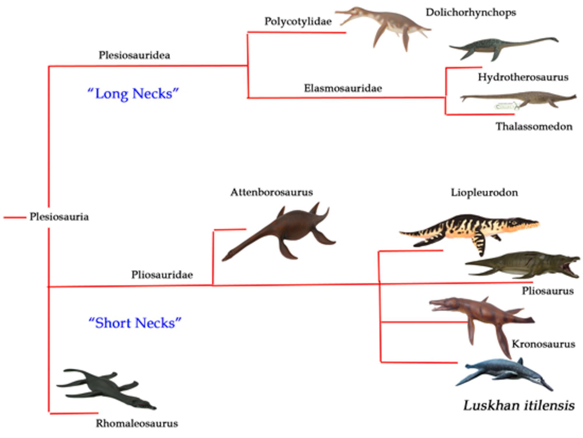如果再往上看分类阶元,那么涵盖了蛇颈龙亚目(Plesiosauroidea)和上龙亚目(Pliosauroidea)的蛇颈龙目(Plesiosauria),就和主龙类同属于主龙形下纲(Archosauromorpha),这个下纲里甚至还包括了如今在地球上依旧繁衍生息的龟鳖类,也就是龟鳖目 Testudines。