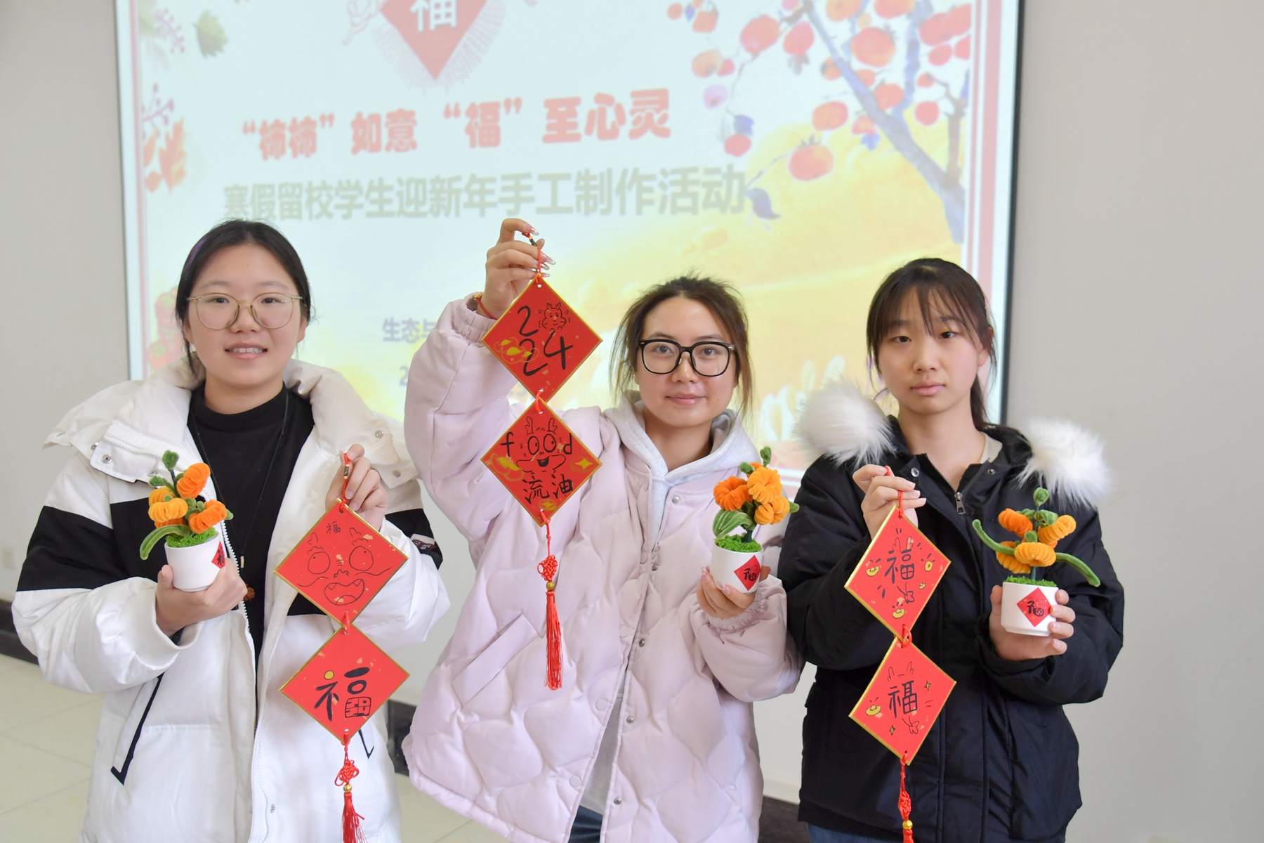 为弘扬传统文化,生态与环境科学学院开展“柿柿”如意树手工制作和创意“福”字书写活动。在场师生还绘制有龙年元素的创意“福”字,同学们将龙年元素融入其中,可爱的小龙和福字完美融合。师生们都表示会将这份美好祝福送给亲朋好友,共同分享收获与喜悦,元气满满迎接新的一年。