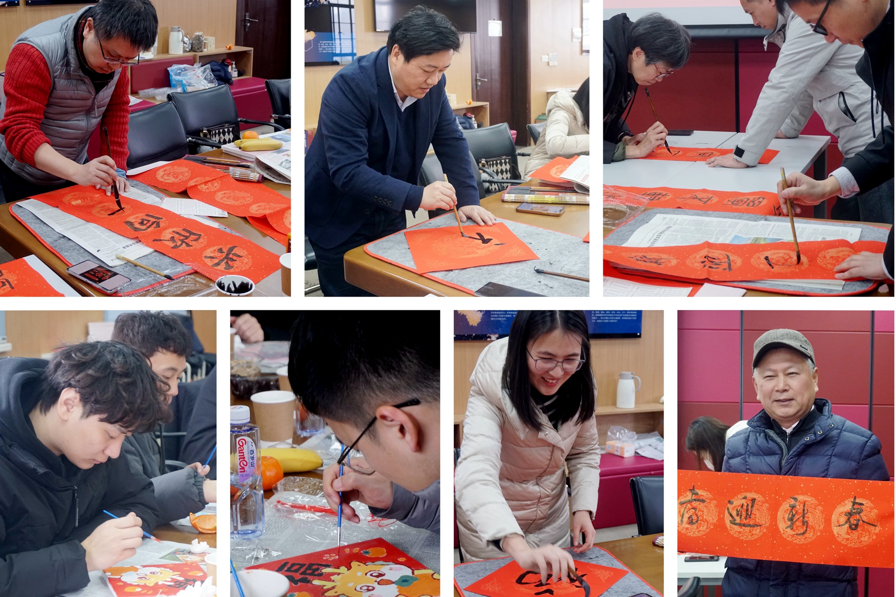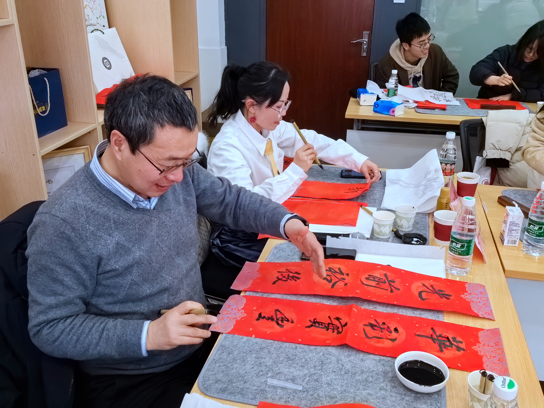 化学与分子工程学院举办了“书香辞旧岁,翰墨迎新春”师生活动。活动现场,墨香四溢,到场师生一同开笔并练习执笔手法后,便迫不及待地投入春联和福字的书写,用笔墨勾勒出一撇一捺,写下心中的一字一句,有对未来一年的美好祝愿,有对科研毕业的满心期待,还有对健康快乐的美丽祝福,处处洋溢着喜庆祥和的欢乐气氛。