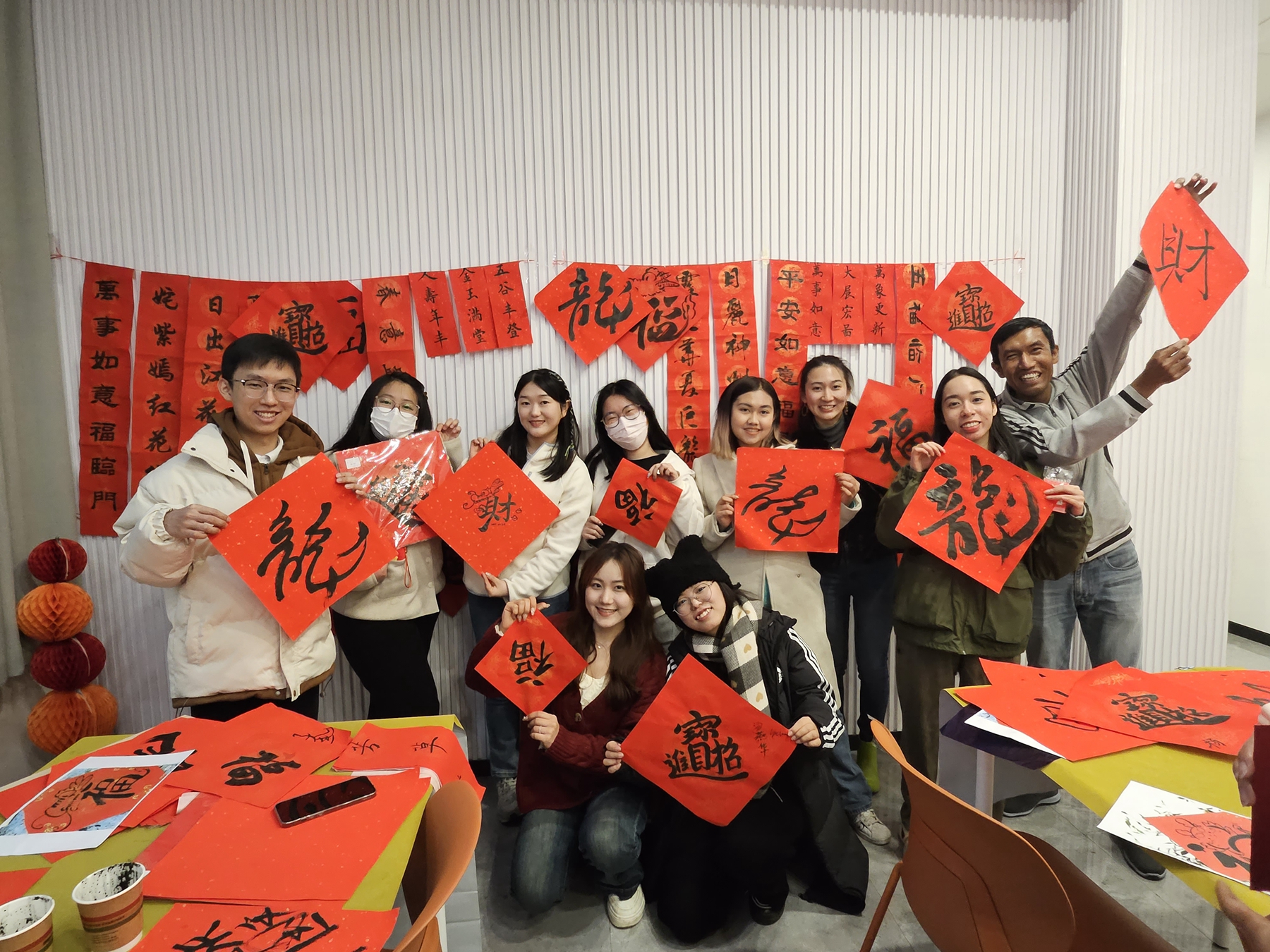 光华书院与社会发展学院在闵行校区联合举办了“无为而为,幸福自得”师生写楹联送祝福活动。师生在学生社区共同书写楹联和创意龙字福,并分别展示和讲解了各自作品创作过程及背后美好的寓意,共同体悟老子思想与民俗传统,用笔墨书香传递对幸福生活的向往,共迎佳节。