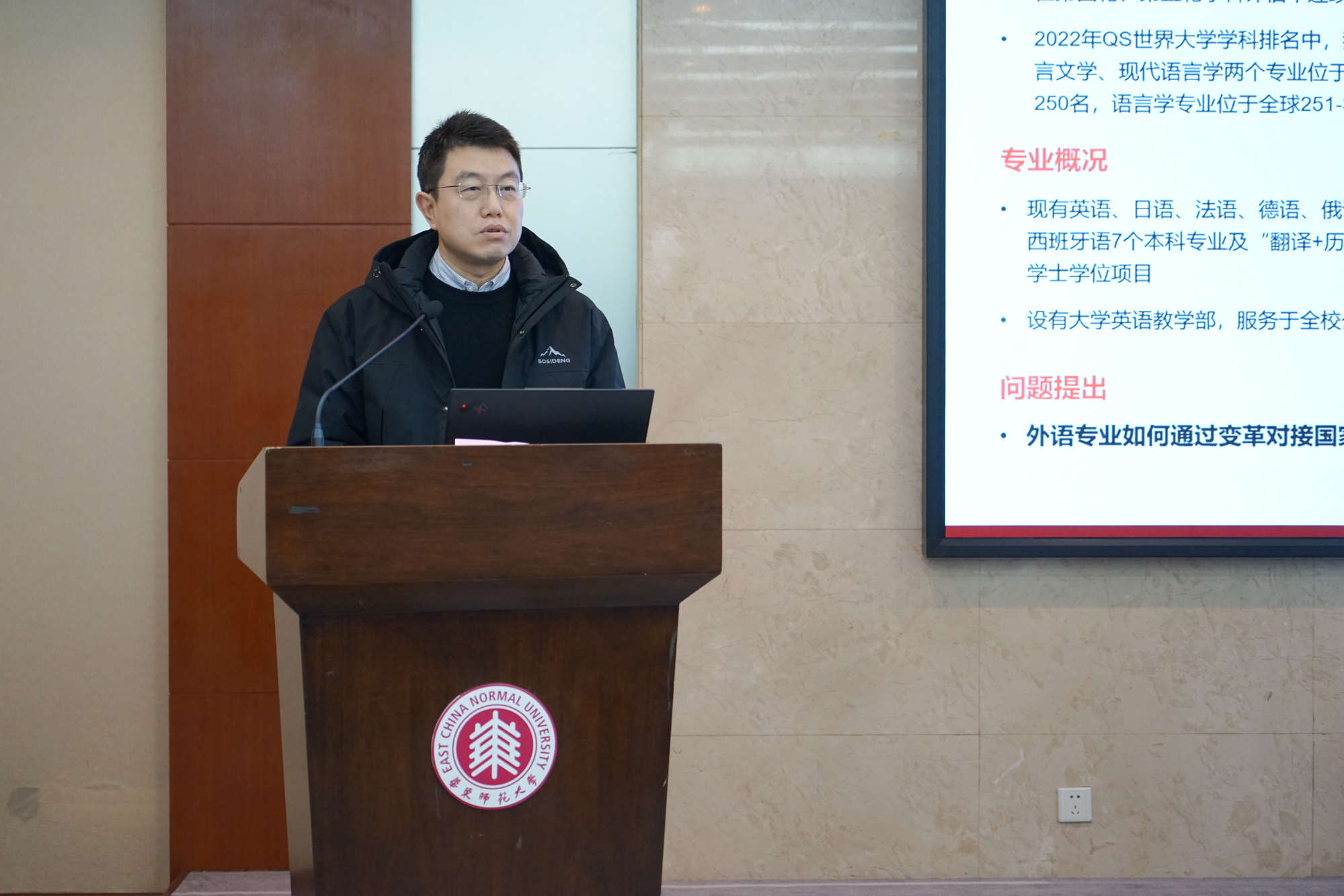 外语学院院长杨延宁汇报了外语学院专业改革情况,学院正通过“双语双科” 复合型人才培养模式改革,贯通式、多语种师范生培养模式改革,语言智能方向规划建设,“一系一策”专业改革与建设,以语言教学与服务助推全校卓越人才培养等举措,打破学院内系部界限,扩展跨院系合作,以培养更多类型的“双语双科”学生,同时协助有需要的院系培养“X+语言”类型学生。