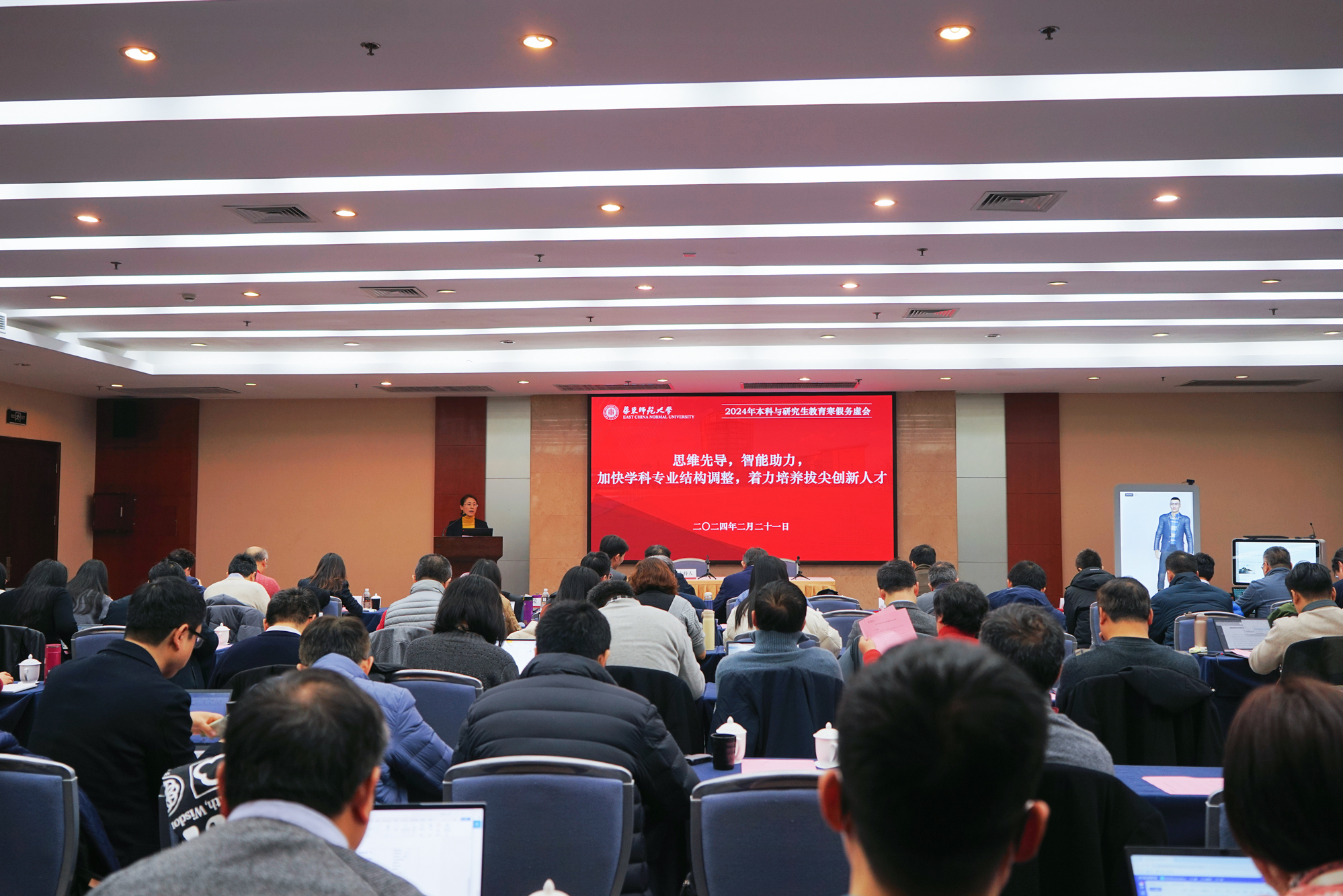 2月21日,华东师大2024年本科与研究生教育寒假务虚会在闵行校区教师之家三楼报告厅召开。会议以“思维先导,智能助力,加快学科专业结构调整,着力培养拔尖创新人才”为主题,深入贯彻落实党的二十大精神、华东师大第十四次党代会精神,落实全校卓越教育“回头看”任务,深入探讨当前人才培养热点问题,助力人才培养质量跃上新台阶,为新一年工作谋好篇、开好局。副校长戴立益,校教学委员会、学位评定委员会代表,各单位分管本科、研究生教学院长,教务处、研究生院、招生办公室、创新创业学院等职能部门、直属单位负责人等120余人出席会议,校长助理、研究生院常务副院长吴健,教务处处长周先荣,校教学委员会主任季浏先后主持会议。