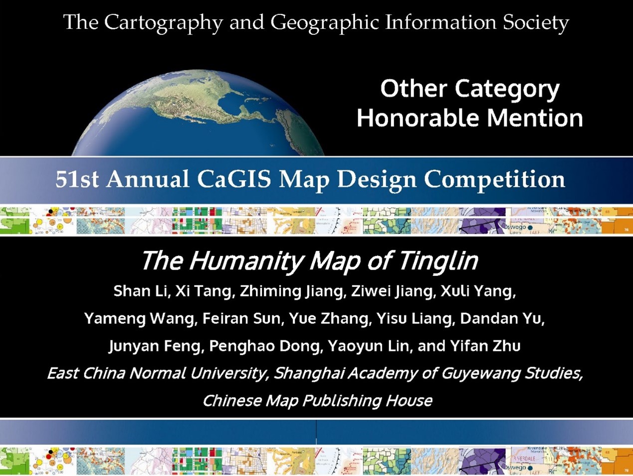 华东师大地图研究所、上海顾野王文化研究院联合主编的《亭林人文地图》荣获专业组“Other”赛道Honorable Mention奖项,这也是华东师大地图研究所连续第六部主编或参编图集作品获得国际奖。