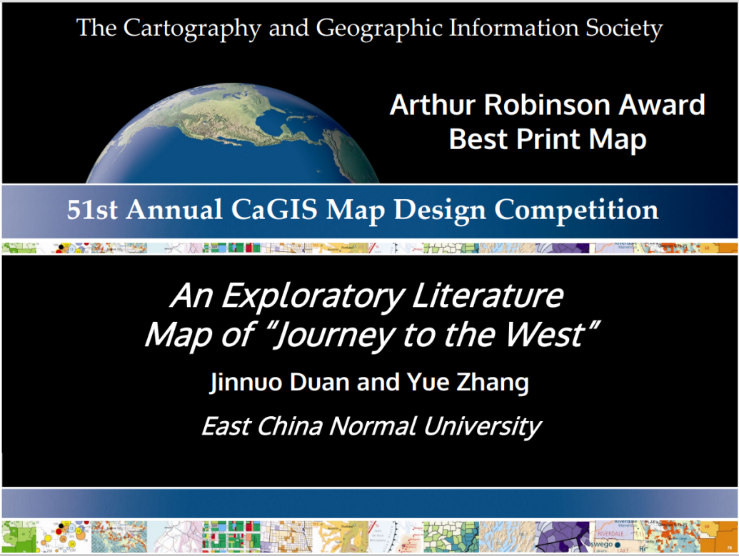 华东师大地理科学学院2022级资源环境(测绘工程方向)专业硕士段金诺为第一完成人设计的“《西游记》文学探索地图”荣膺学生组“Arthur Robinson Award for Best Printed Map”奖项Winner,是继去年五名本科生合作的专题地图作品《与鲸共舞》获得该奖项Honorable Mention后更上层楼,再添殊荣。