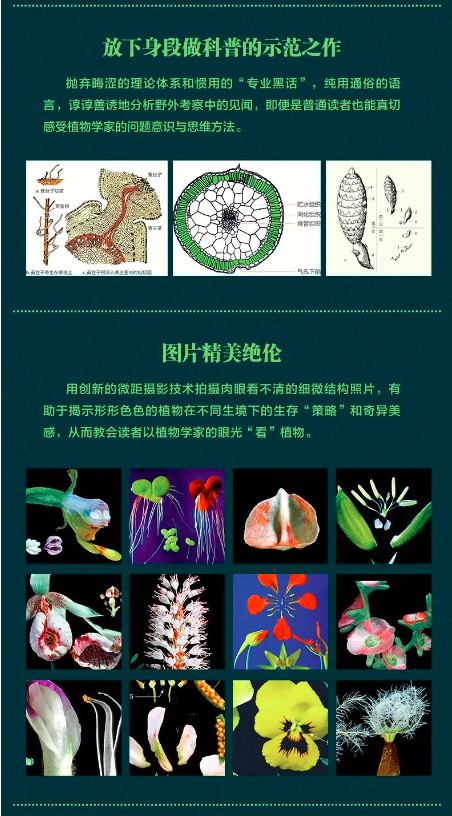 在书中,马炜梁教授以平易近人的语言,谆谆善诱地分析自己野外考察中的所见所闻。除了文字之外,《植物的“智慧”》还配备了精美绝伦的图片。这些图片由马炜梁教授亲自拍摄,利用创新的微距摄影技术,捕捉到了肉眼难以察觉的植物细微结构。这些图片不仅展示了形形色色的植物在不同环境下的生存“策略”和奇异美感,从而教会读者以植物学家的眼光“看”植物。在这本趣味盎然、图文并茂的科普著作里,马炜梁教授以丰富的实例和图片,令人信服地揭示了植物在演化进程中所形成的与根茎叶、花朵、果实与种子等相关的种种“智慧”,证实并丰富了达尔文的自然选择学说。